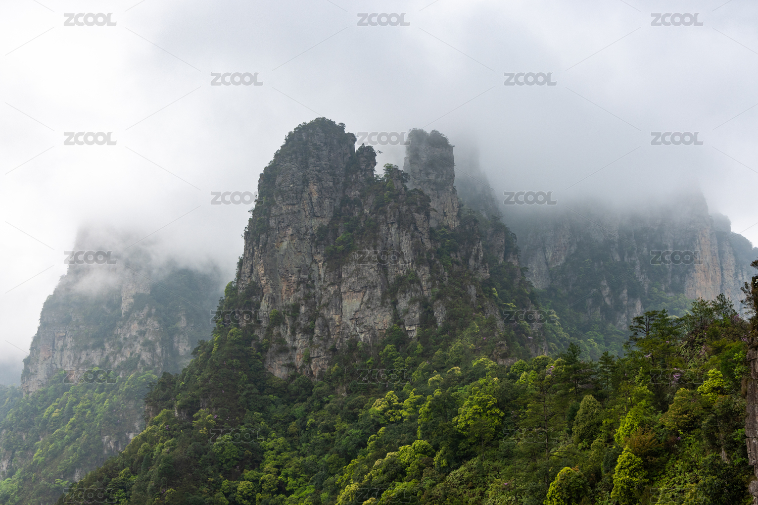 绿色的巍峨高山顶峰云雾缭绕犹如仙境