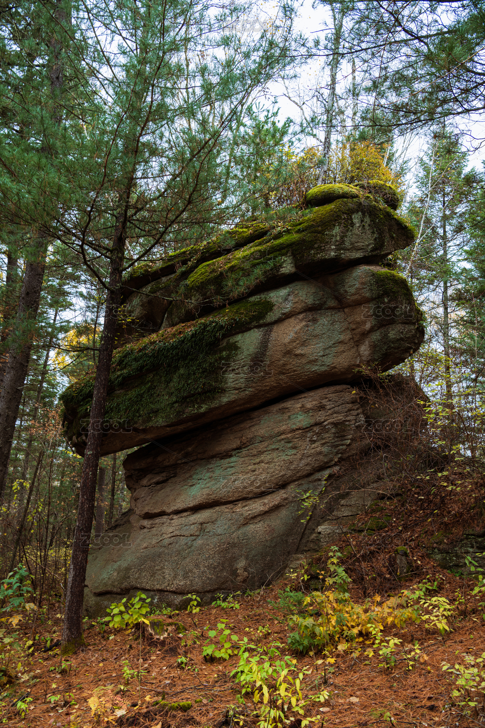 中国大兴安岭金秋苍山石林景区生长着苔藓的奇石与树