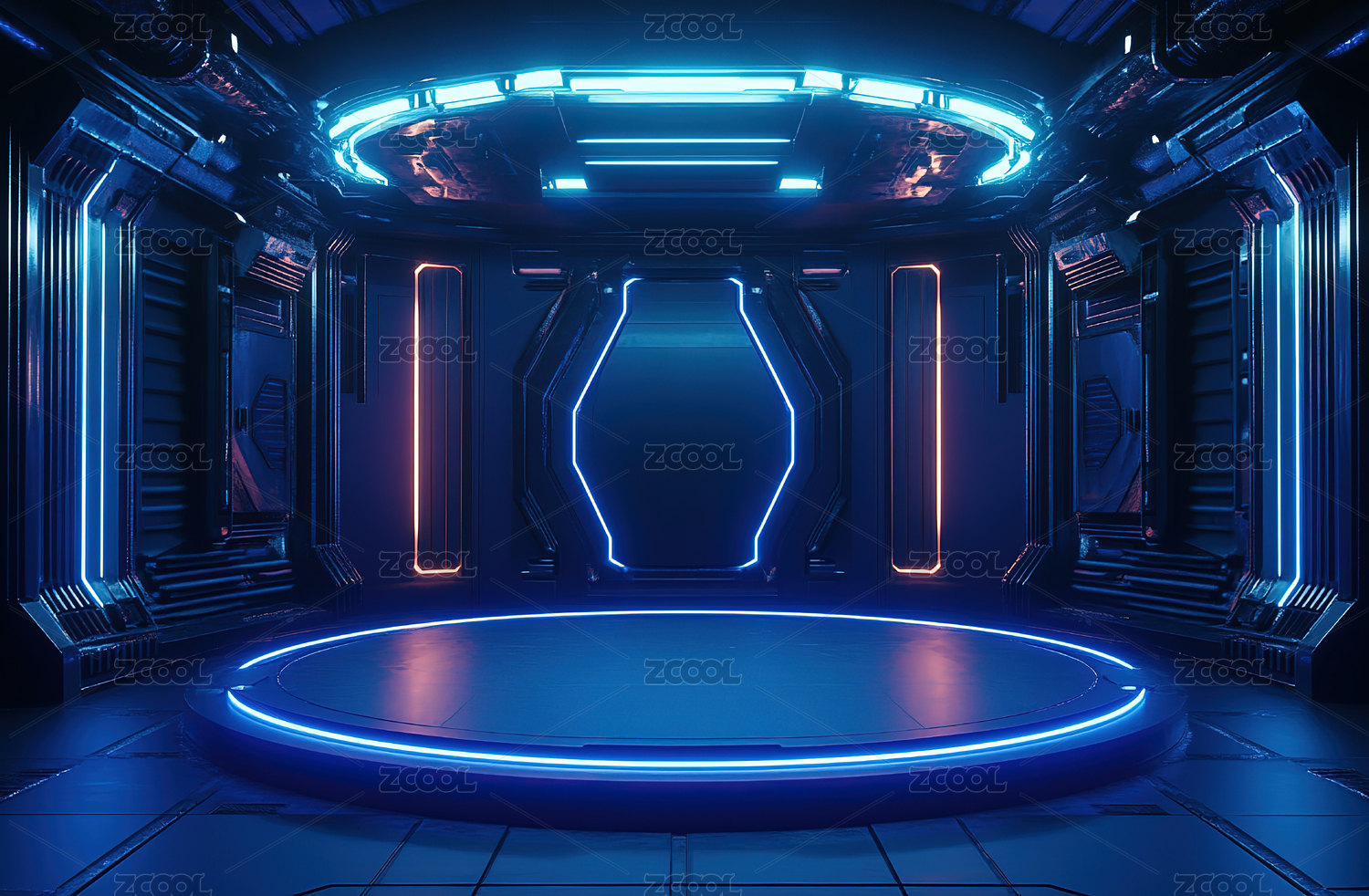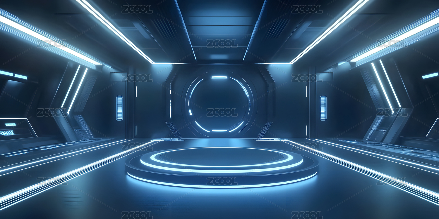 未来科技舞台,蓝色霓虹灯环绕