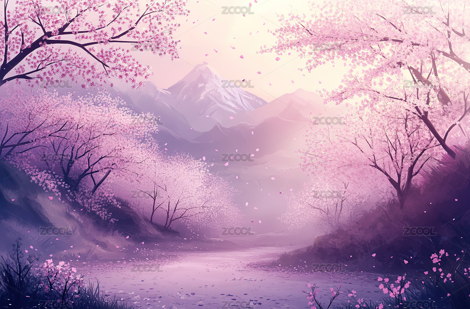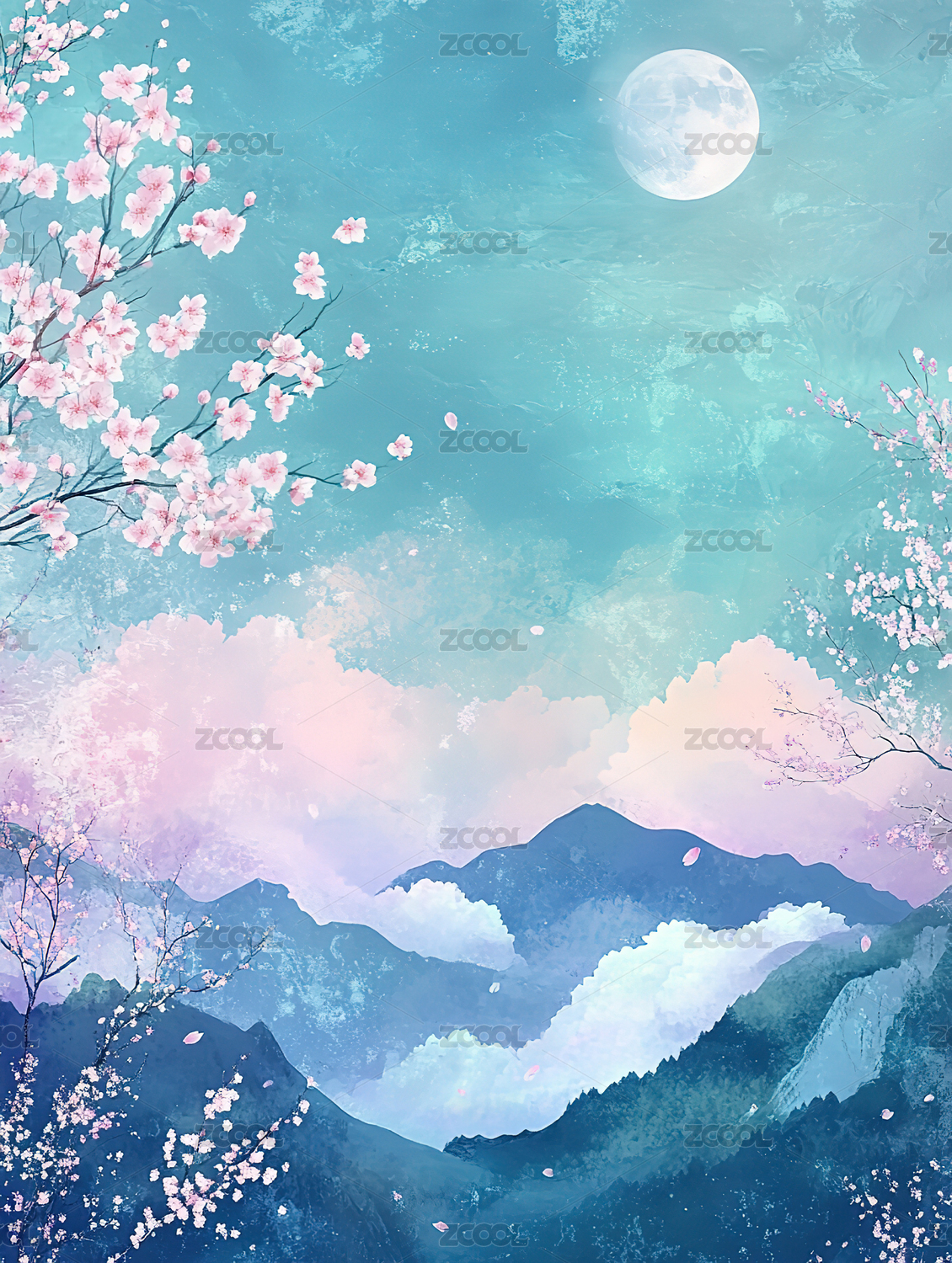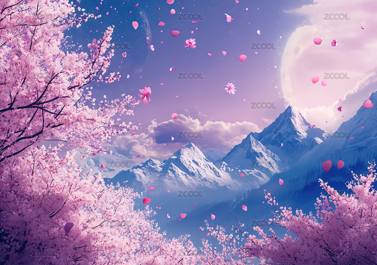 夜晚山谷中桃花林里花瓣飞舞,月亮悬挂在天空插画背景