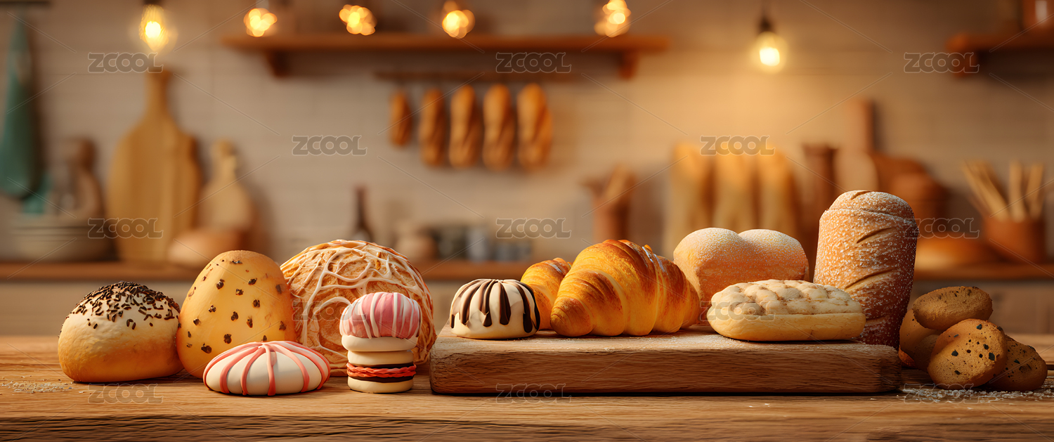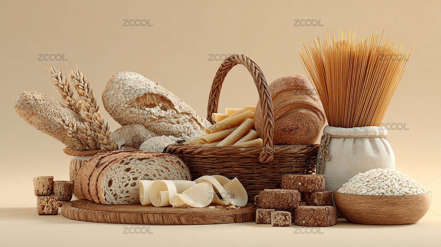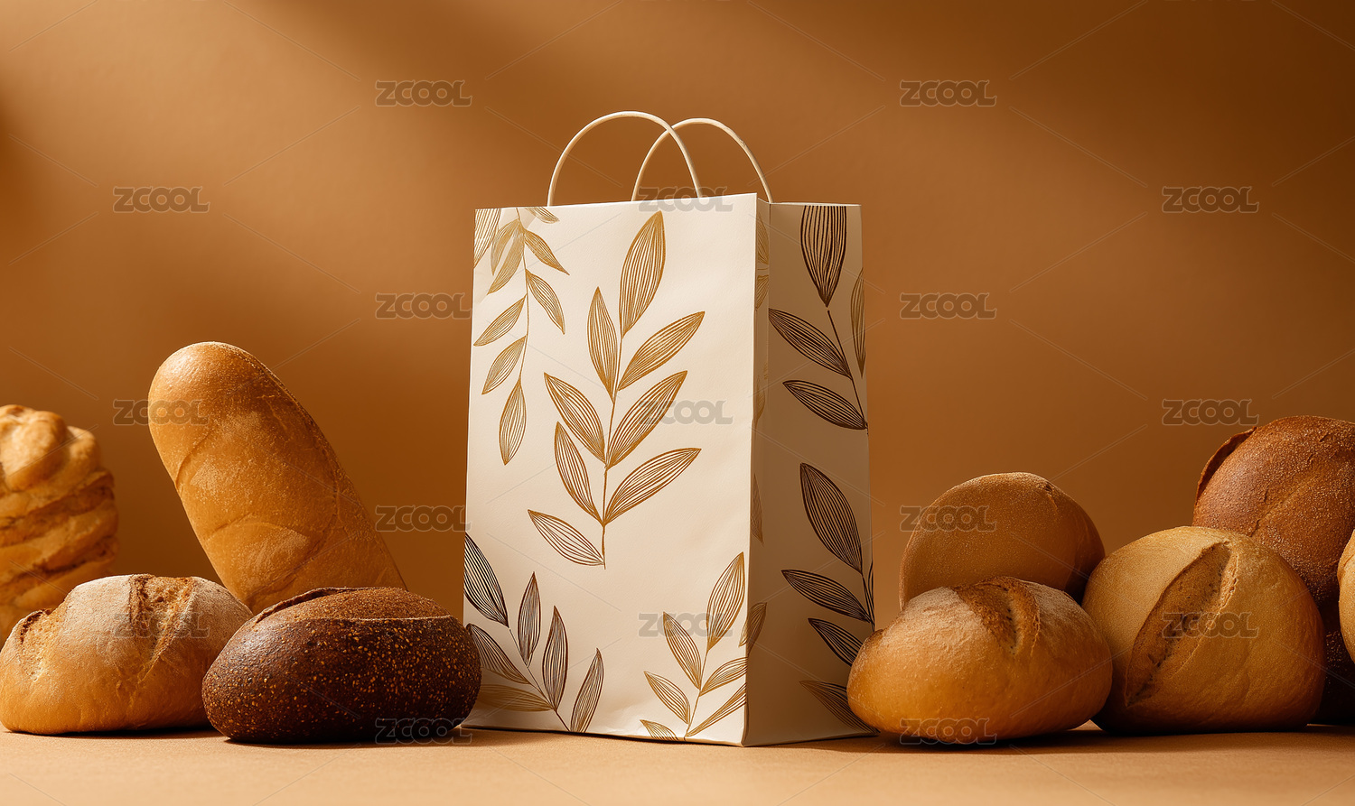 棕色背景带叶纹纸袋旁摆面包麦穗