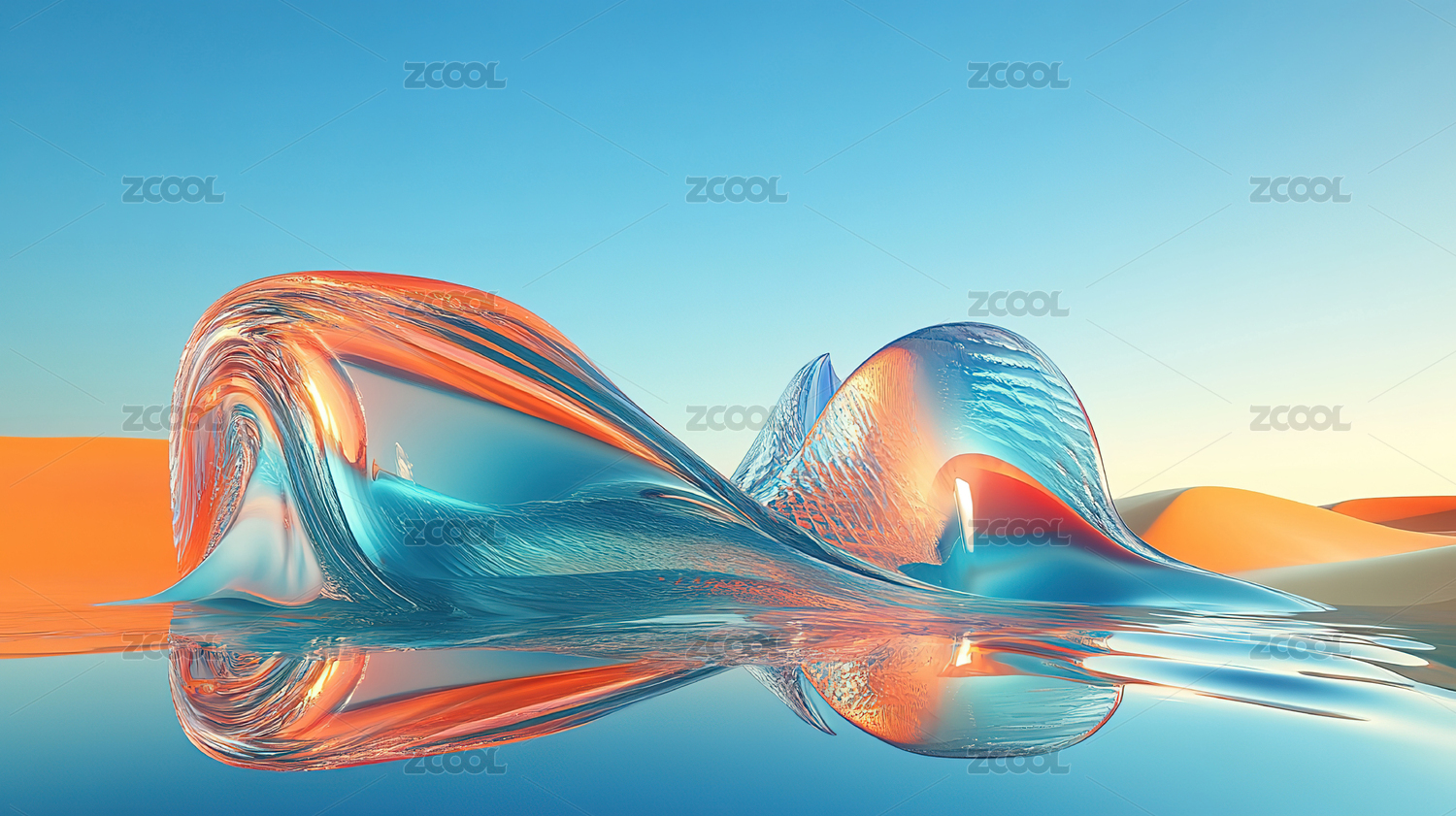 斑斓的玻璃质感缎带流动在水面上3d渲染