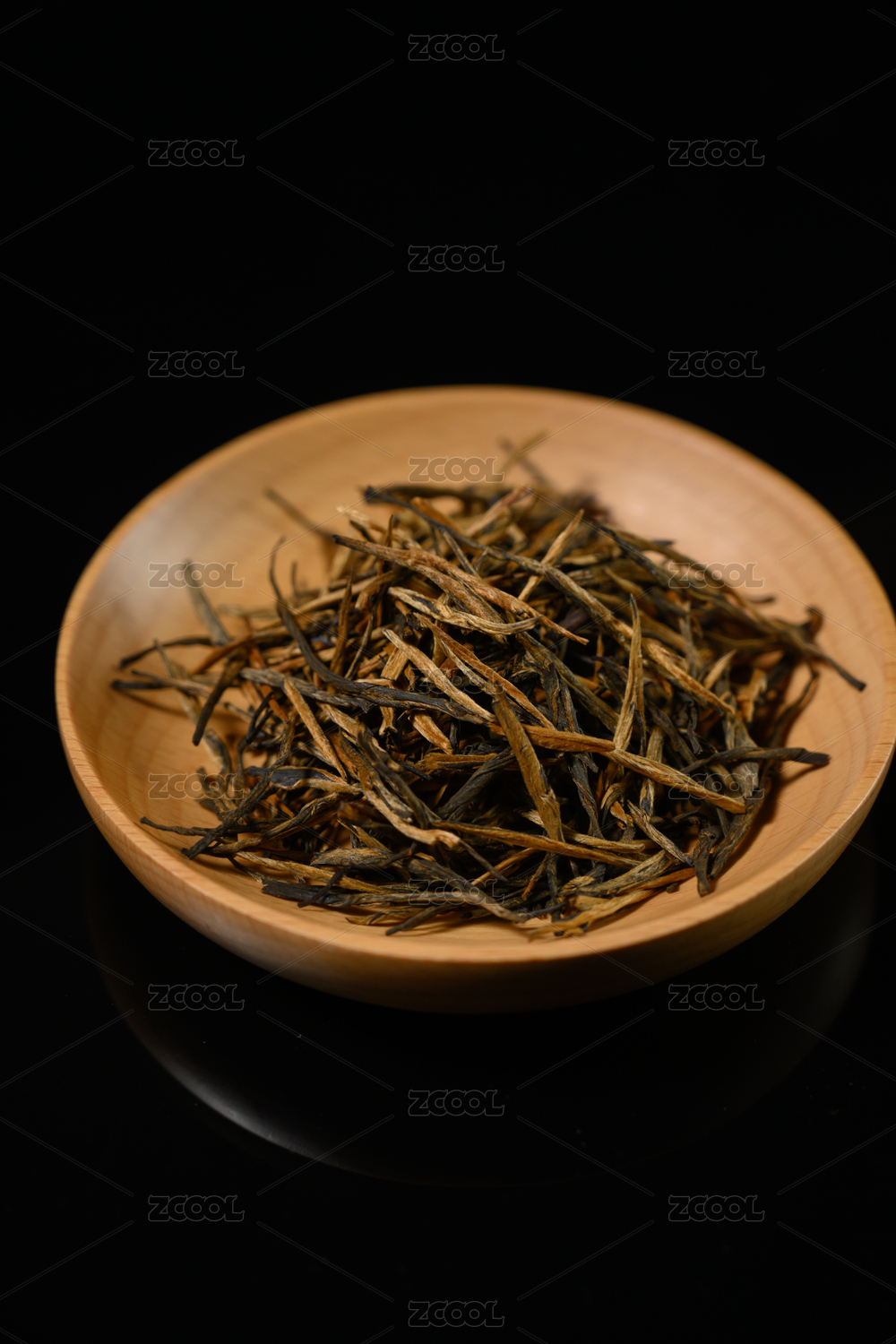 桌面上的盘子里的干爽切香气四溢的滇红金针