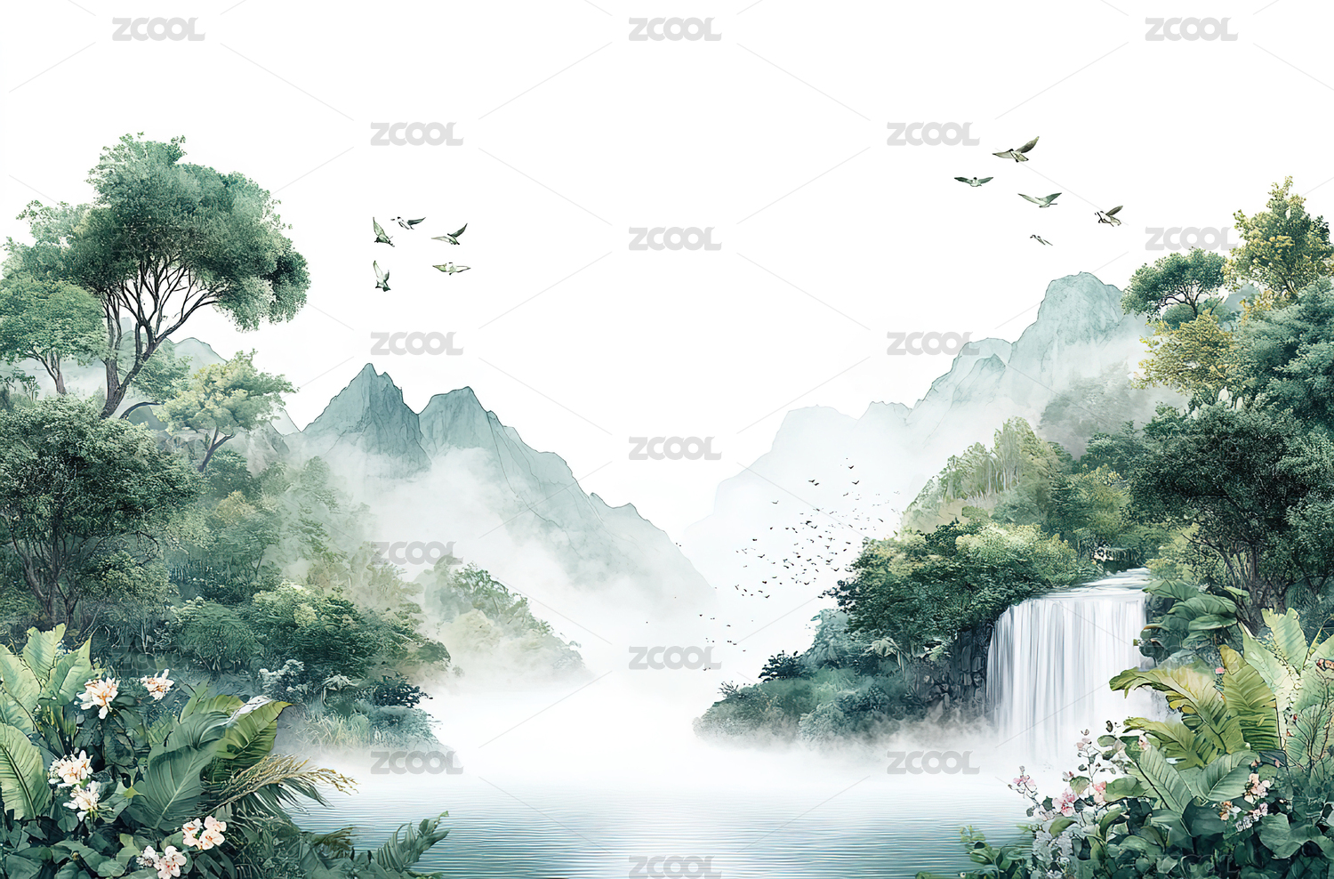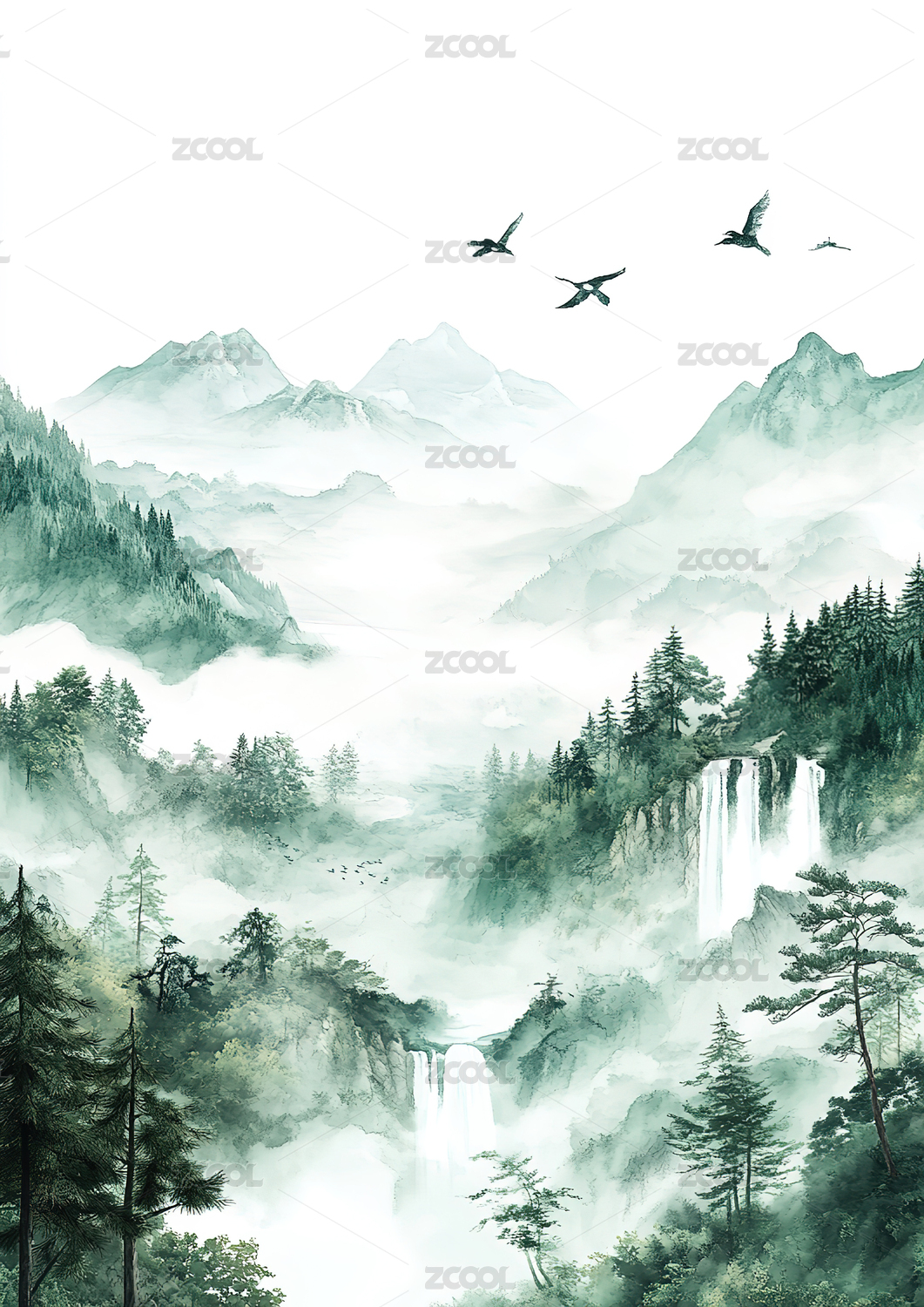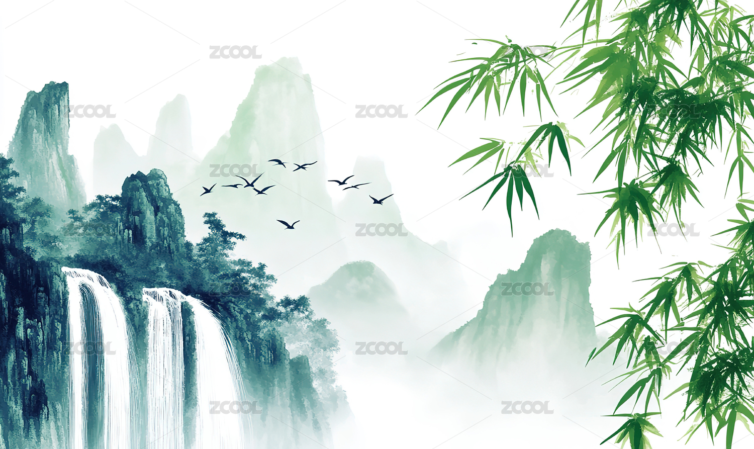 绿色山水新中式背景素材