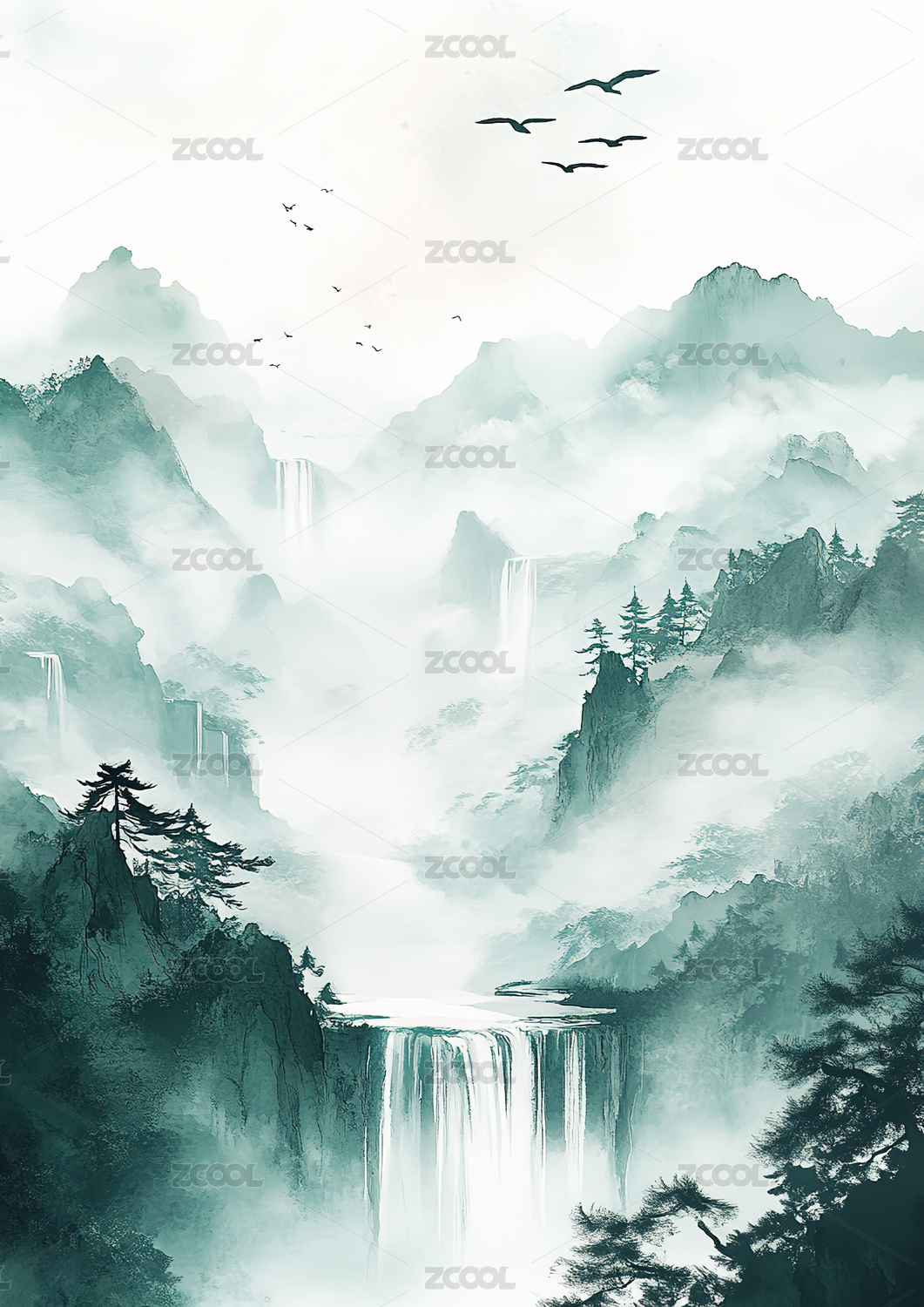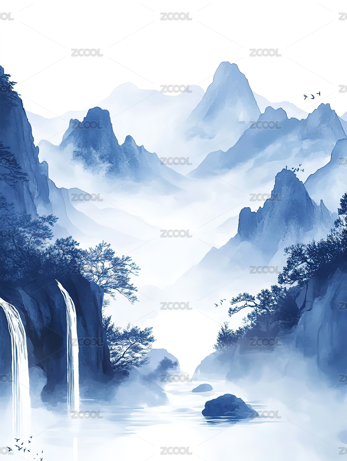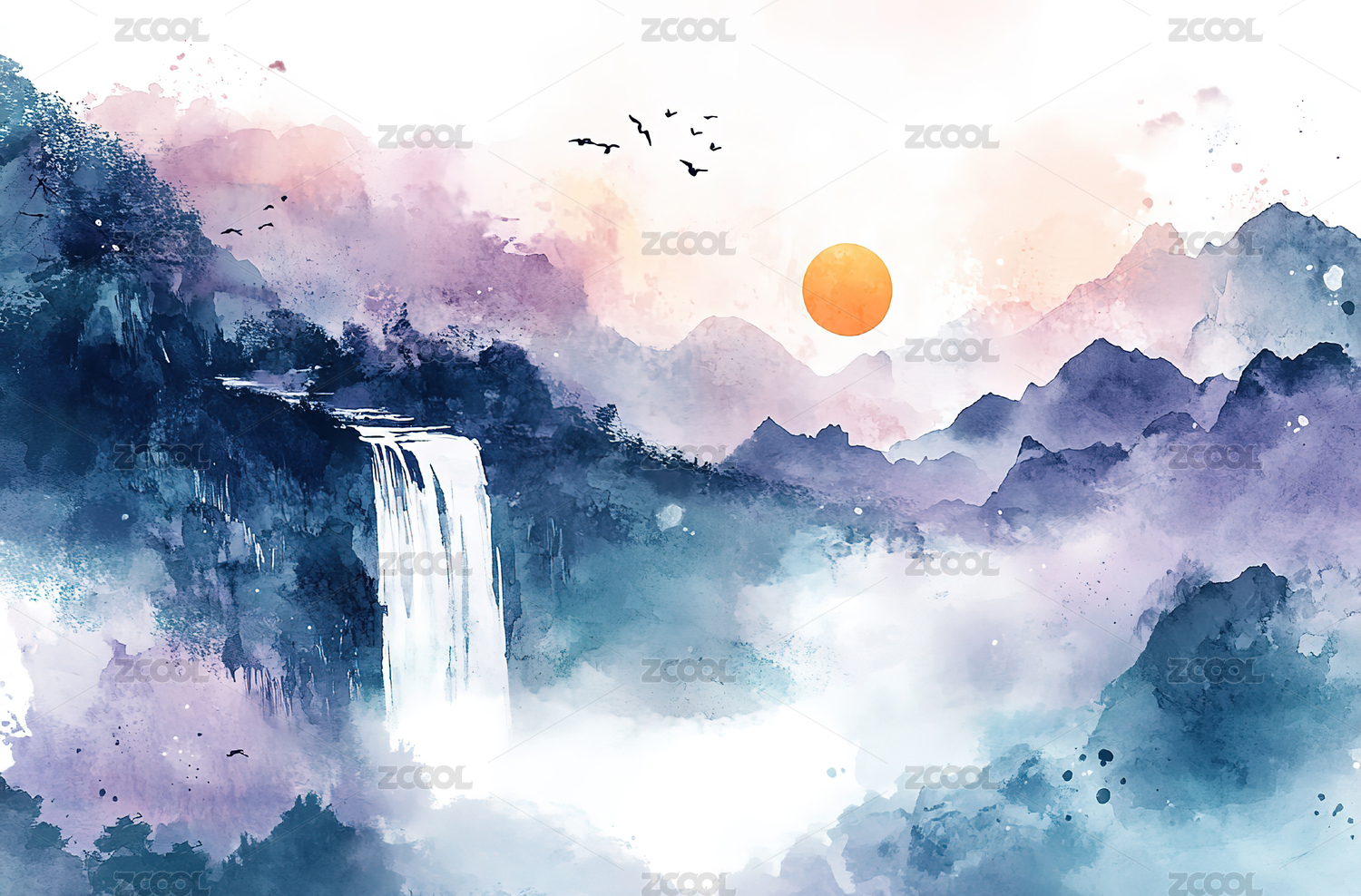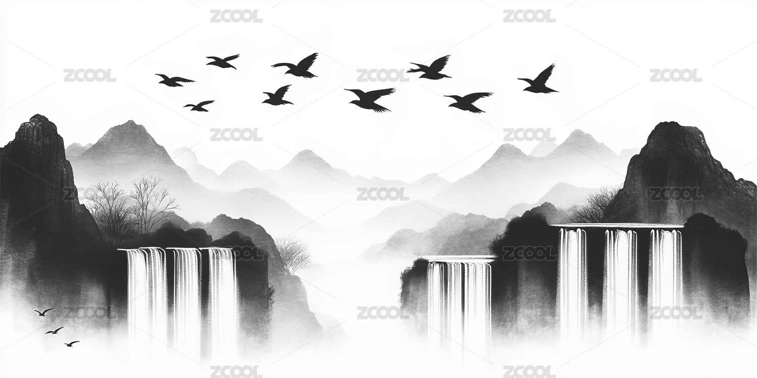 水墨山瀑布风景画
