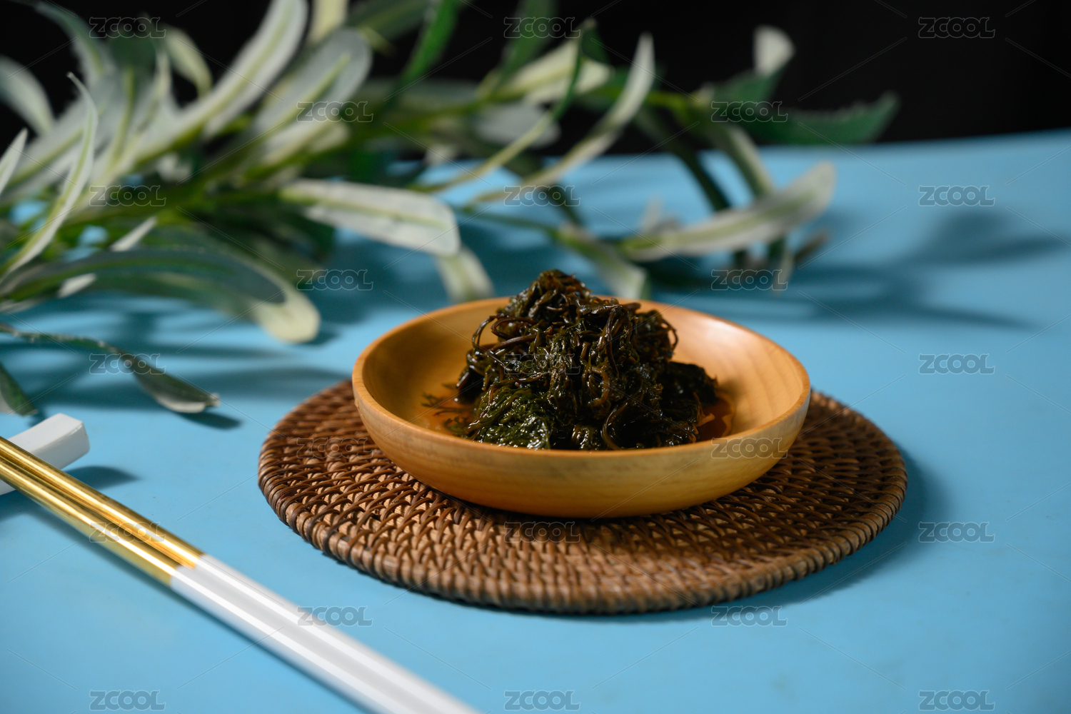 桌面上的盘子里的美味可口的凉拌苏子叶