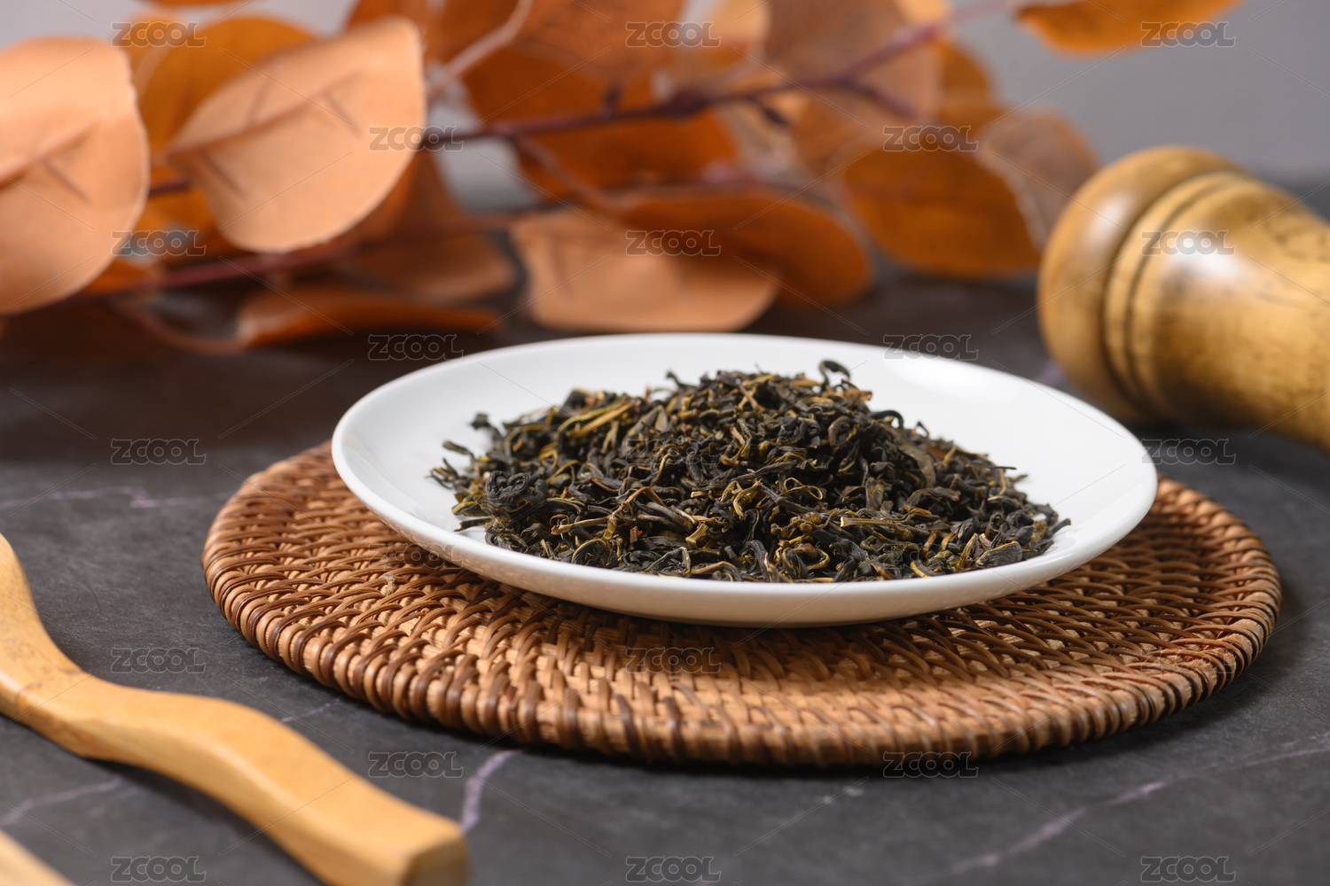 桌面上的竹盘子里的金骏眉和玻璃杯里的红茶
