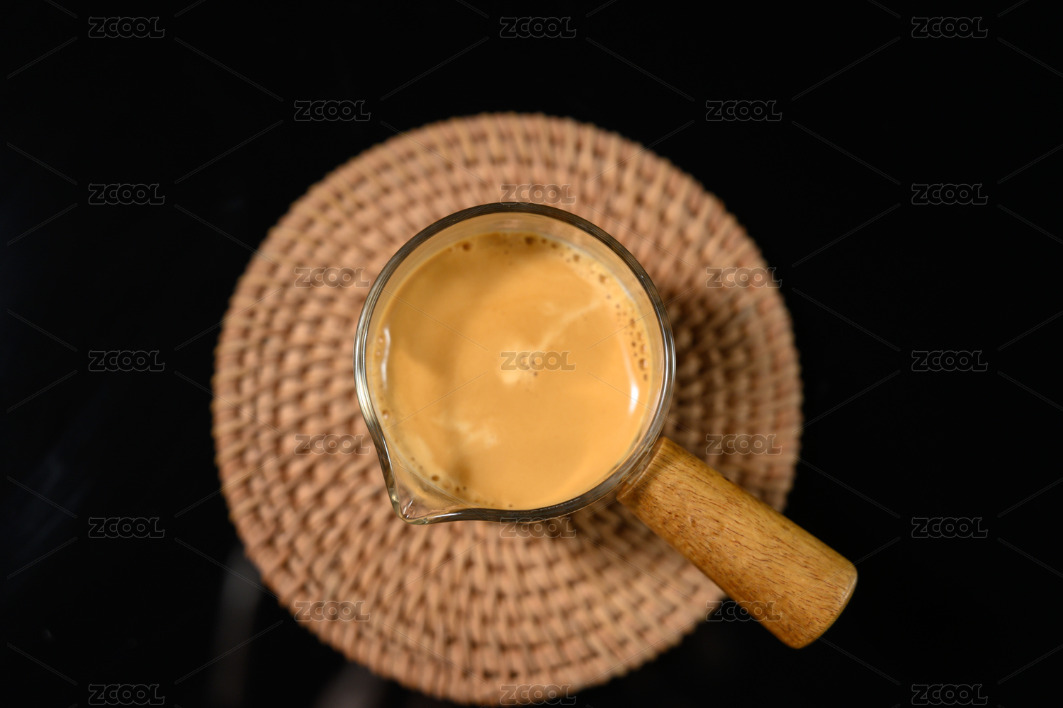 桌面上的杯子里的香气四溢的意式特浓咖啡
