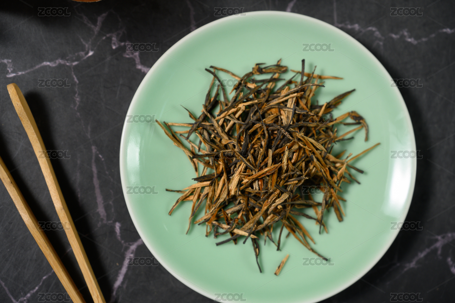 桌面上的盘子里的干爽切香气四溢的滇红金针