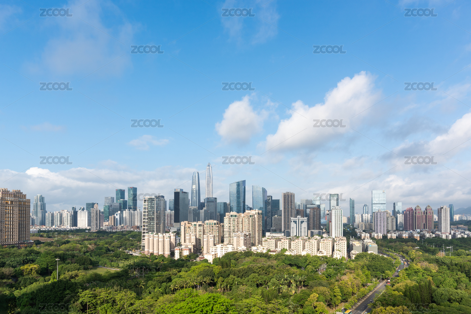 蓝天白云下的中国广东省深圳城市建筑天际线高楼大厦风光