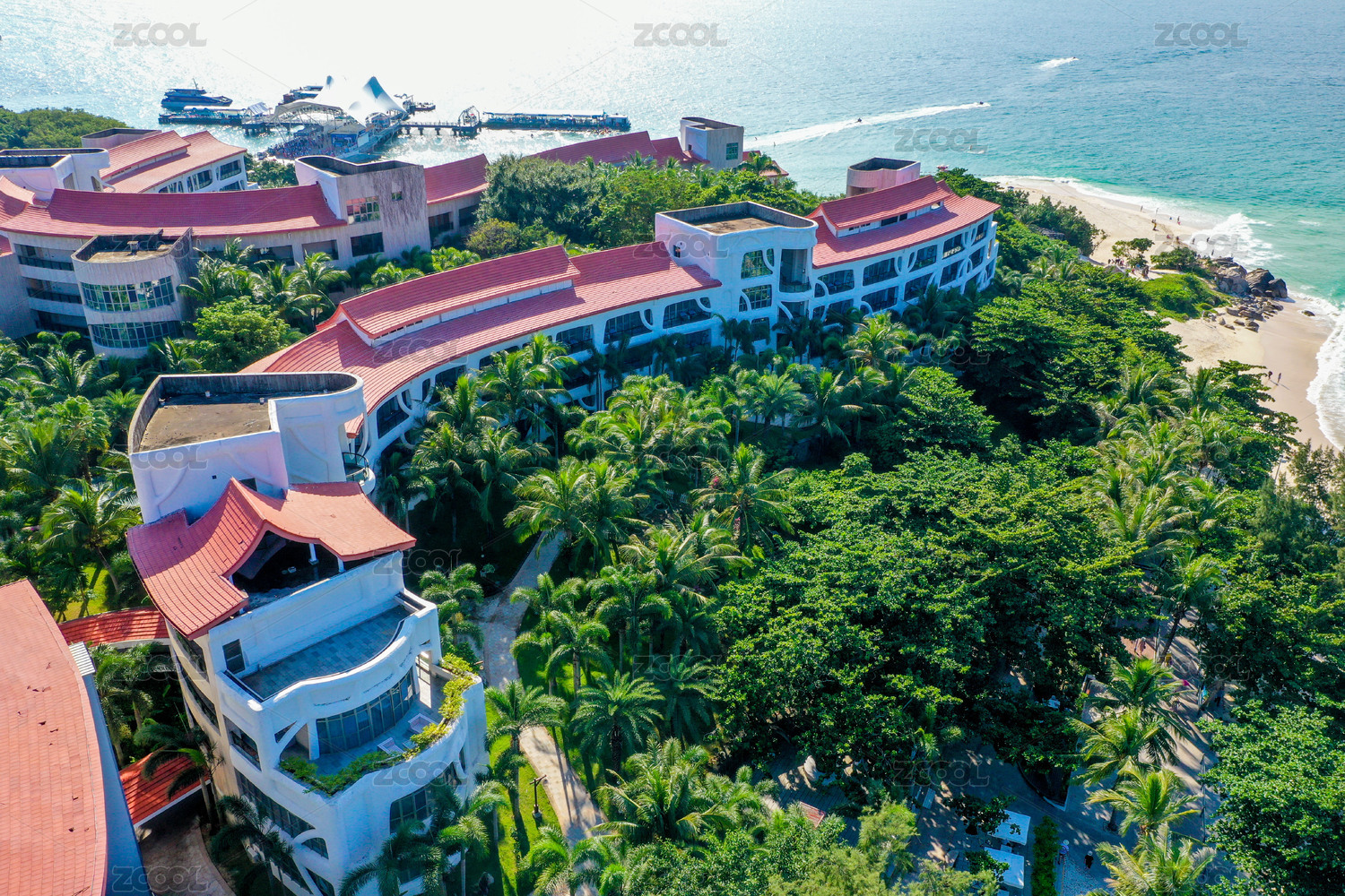 航拍海南三亚蜈支洲岛热带小岛岛上酒店客房
