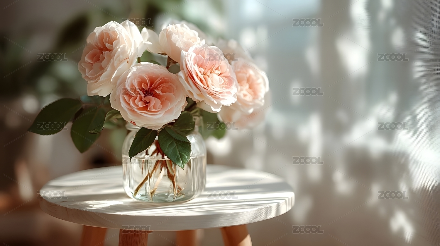 一束鲜艳的玫瑰花摆放在厨房桌上的花瓶中