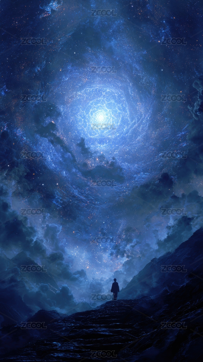 彩晕染, 极简构图, 瀑布, 黑白, 人影, S型小路, 蓝色调, 大小对比, 磨砂颗粒,手绘