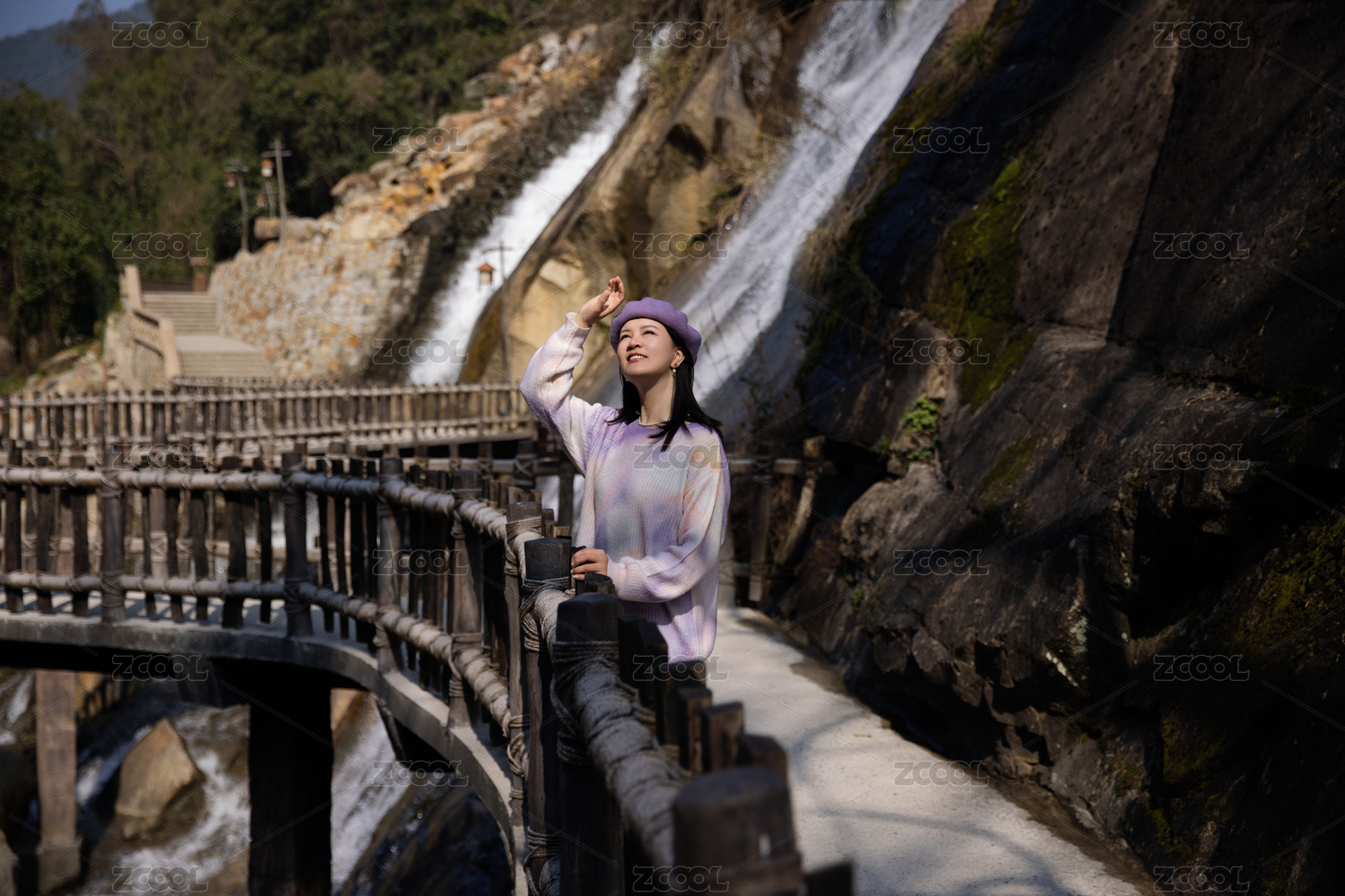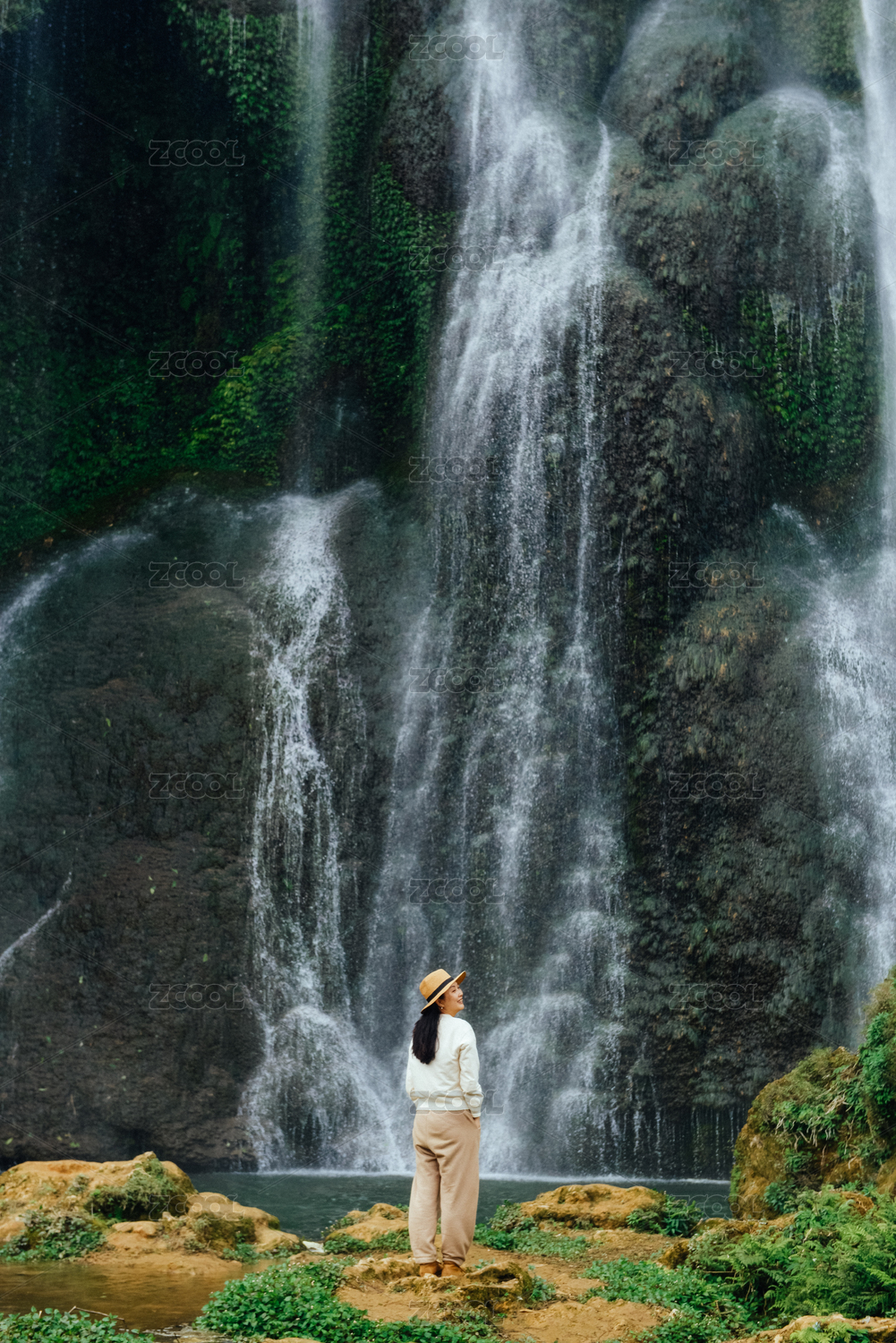 一位亚洲女性在广西靖西三叠岭瀑布旅游