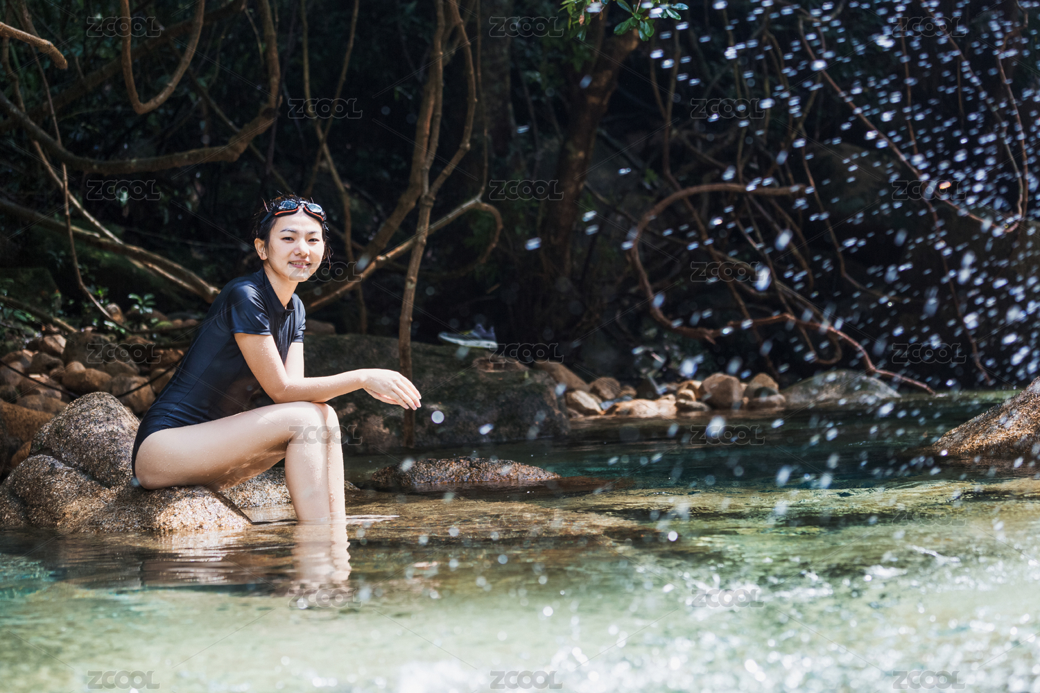 中国美女在泰国甲米的兰塔岛瀑布游玩