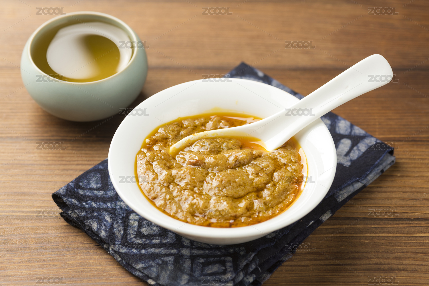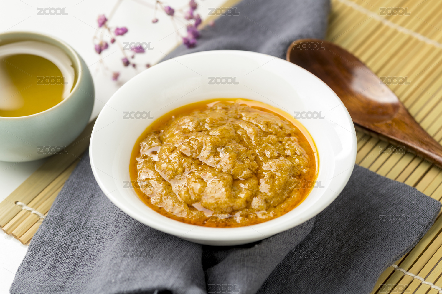 蟹黄鲜酱摆放在桌面上勺盛蟹黄酱特写