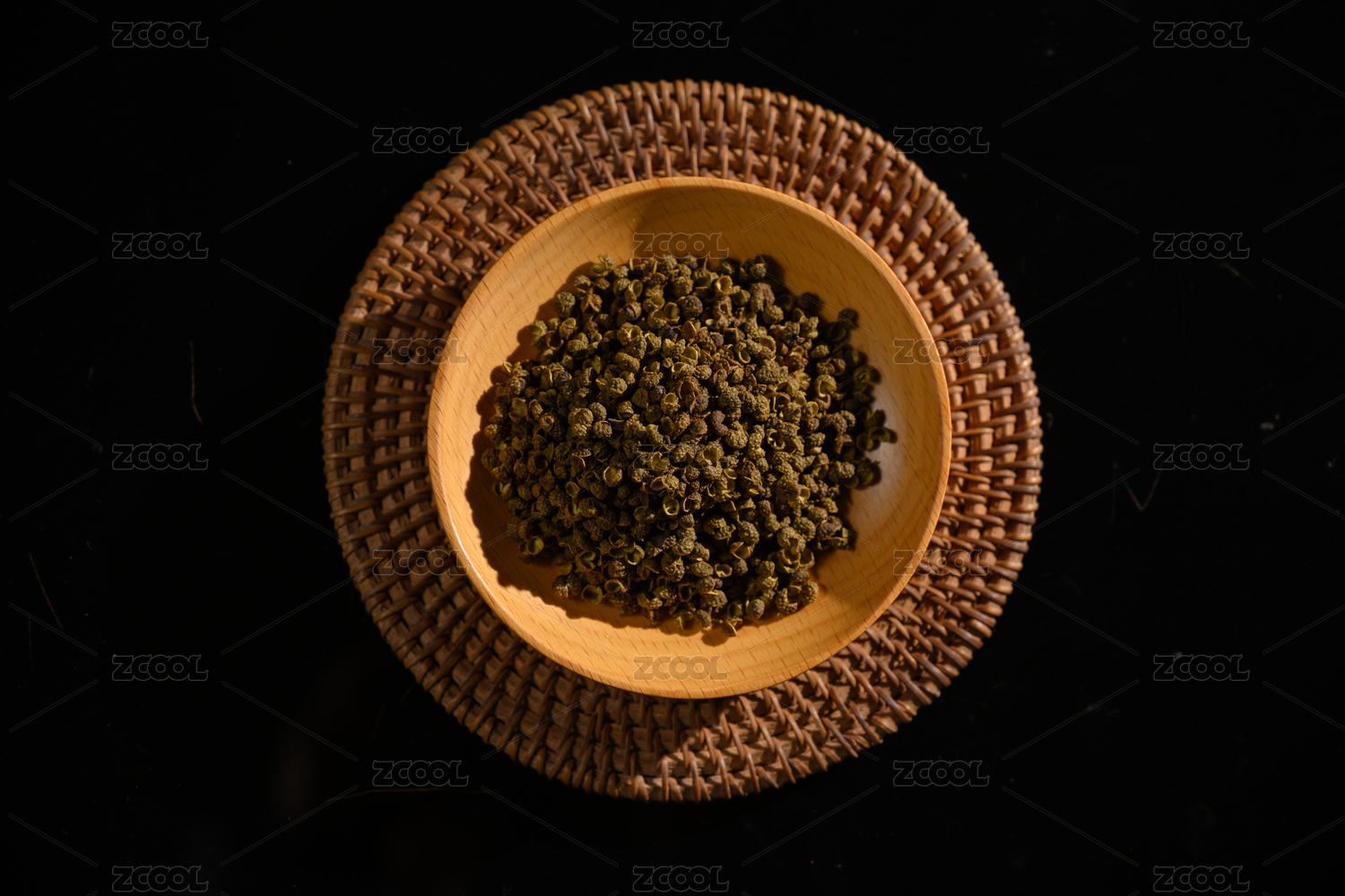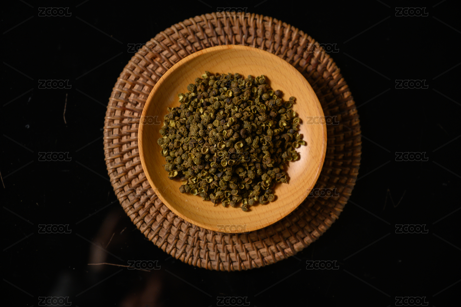 装在筲箕里面的大量的干花椒,下面是白色背景和少量散落的花椒