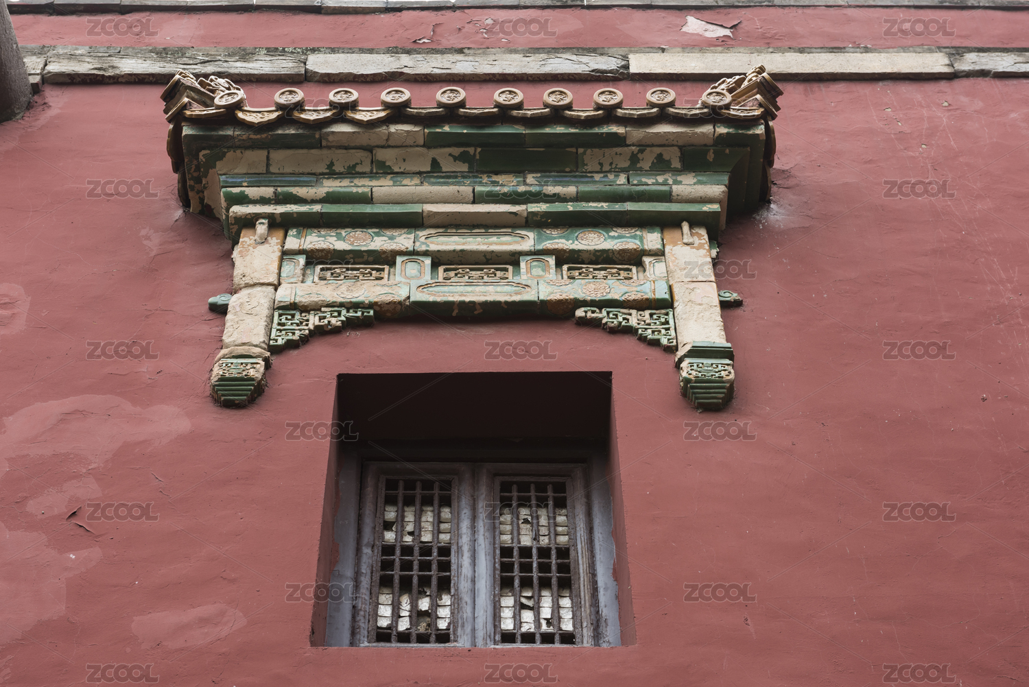 红墙上的砖砌门洞实木镂空中式门窗