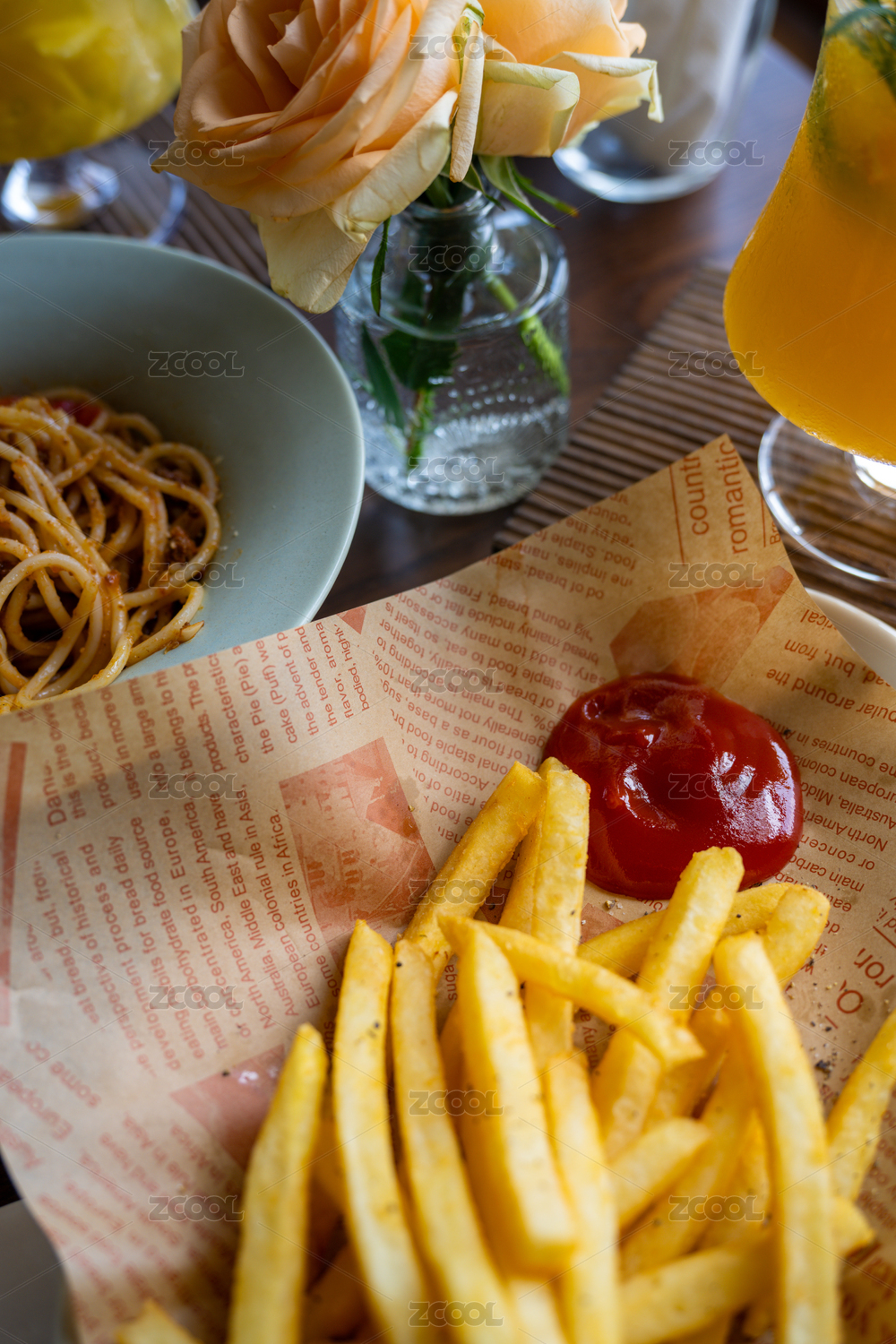 美味的薯条和意大利面
