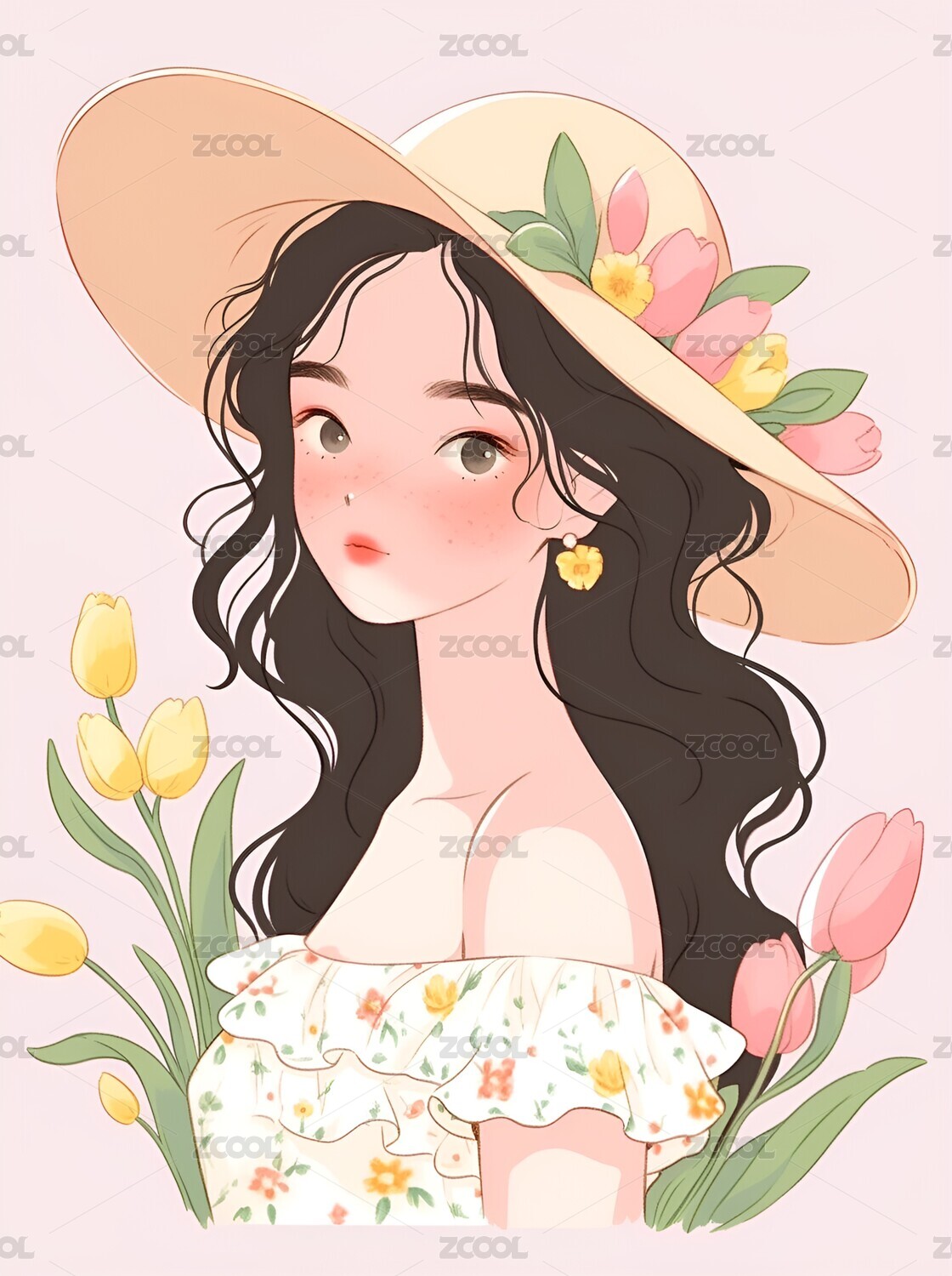 鲜花和女孩的头像插画