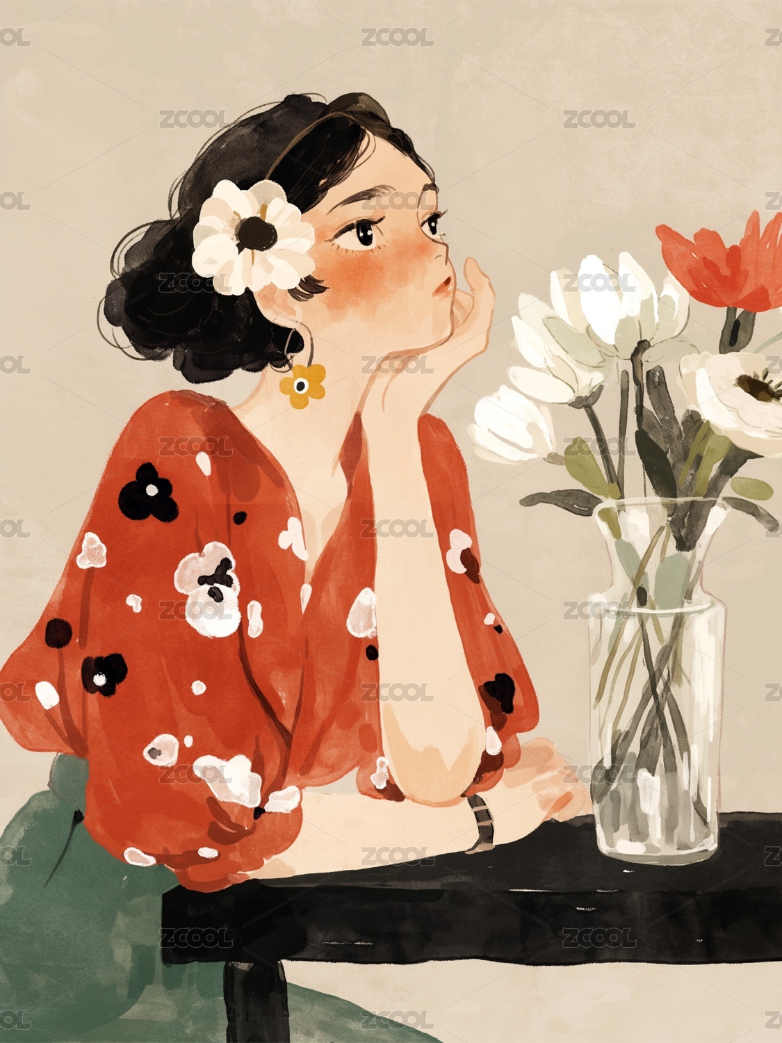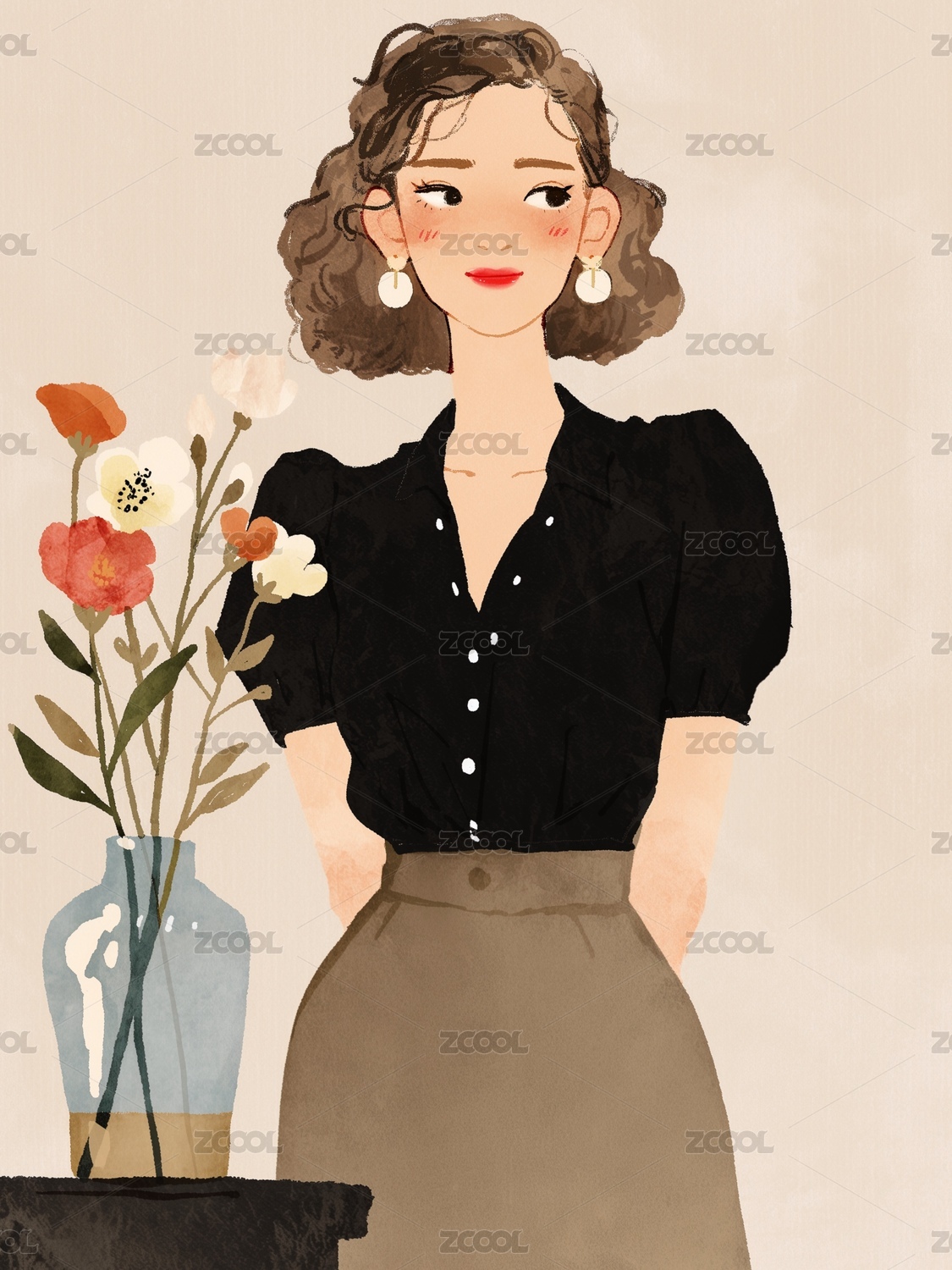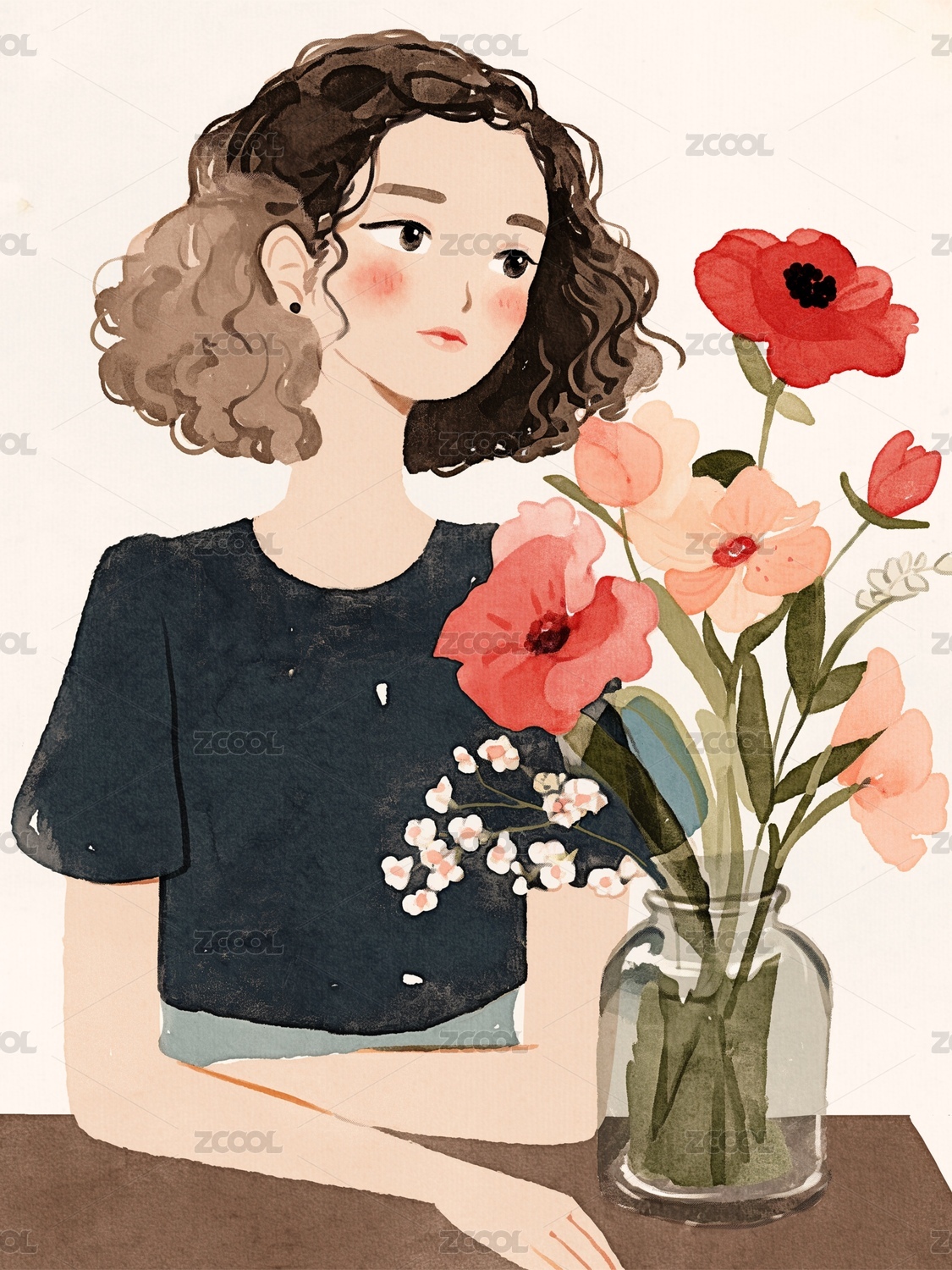 花瓶,少女,微笑,耳环,水彩风,扁平风,插画