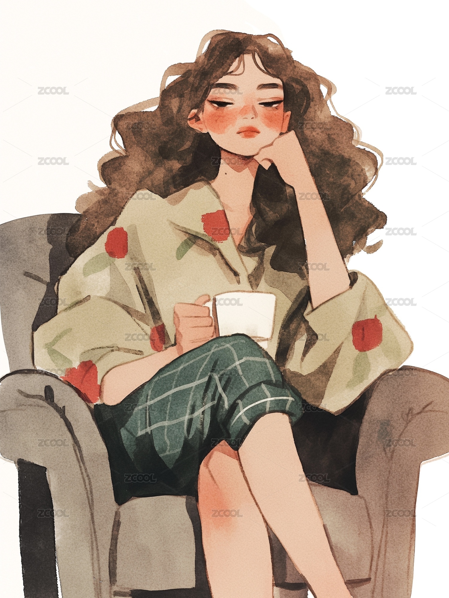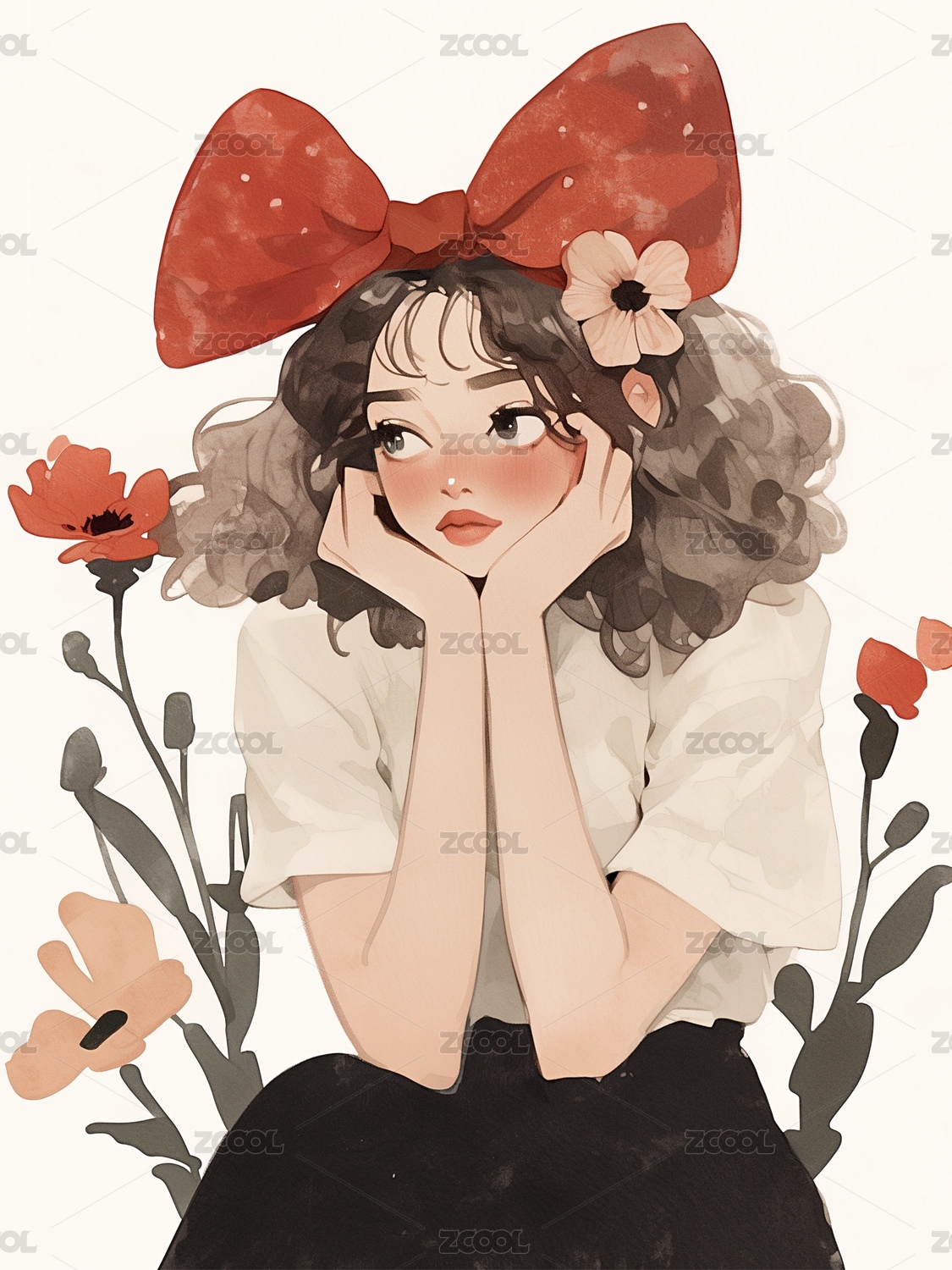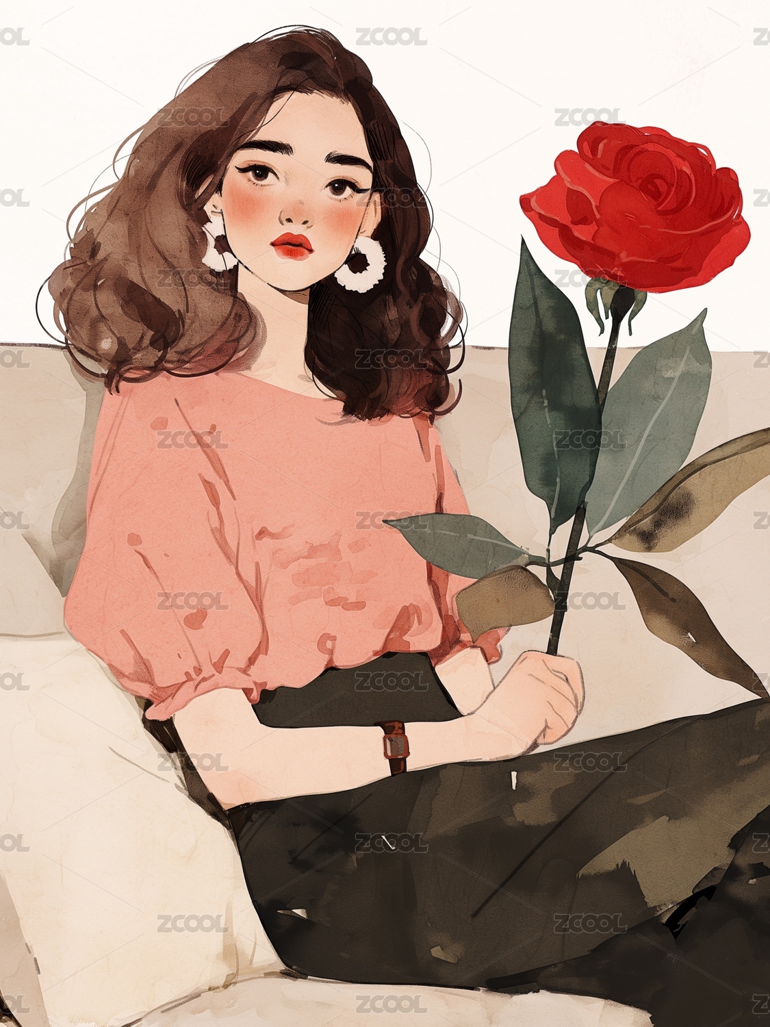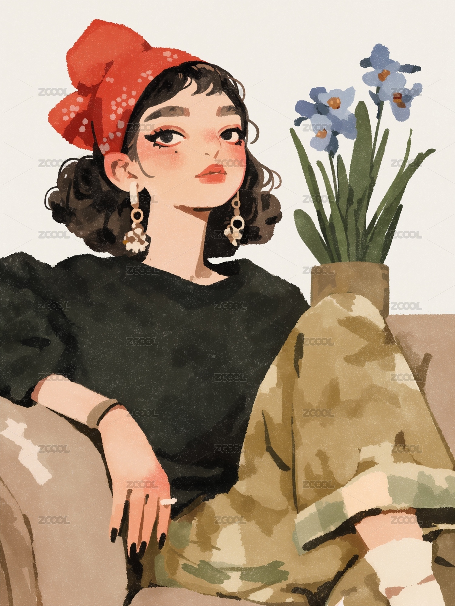 花瓶,少女,微笑,耳环,水彩风,扁平风,插画