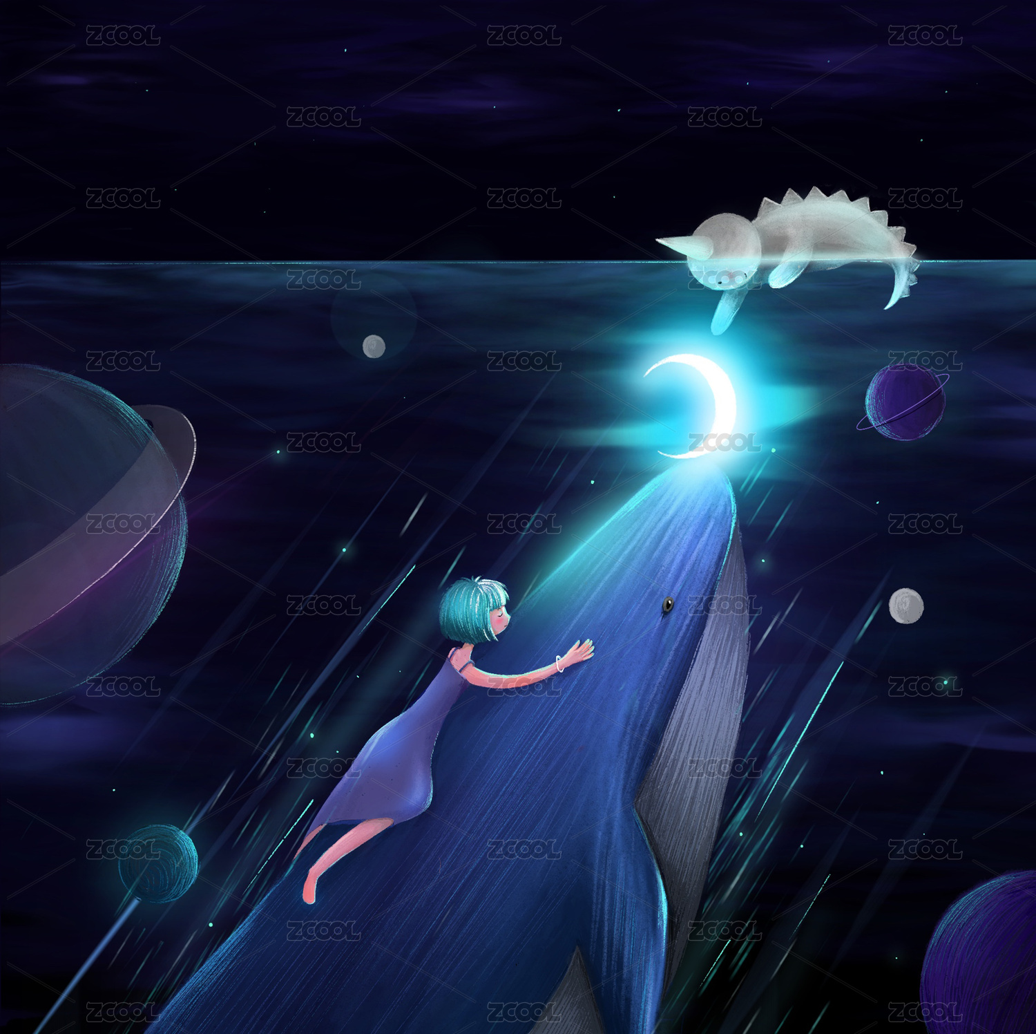 鲸鱼女孩插画