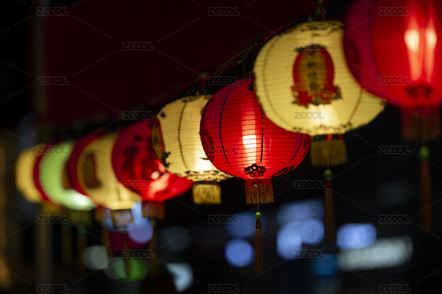 悬挂着的五颜六色的中国传统灯笼的夜景特写