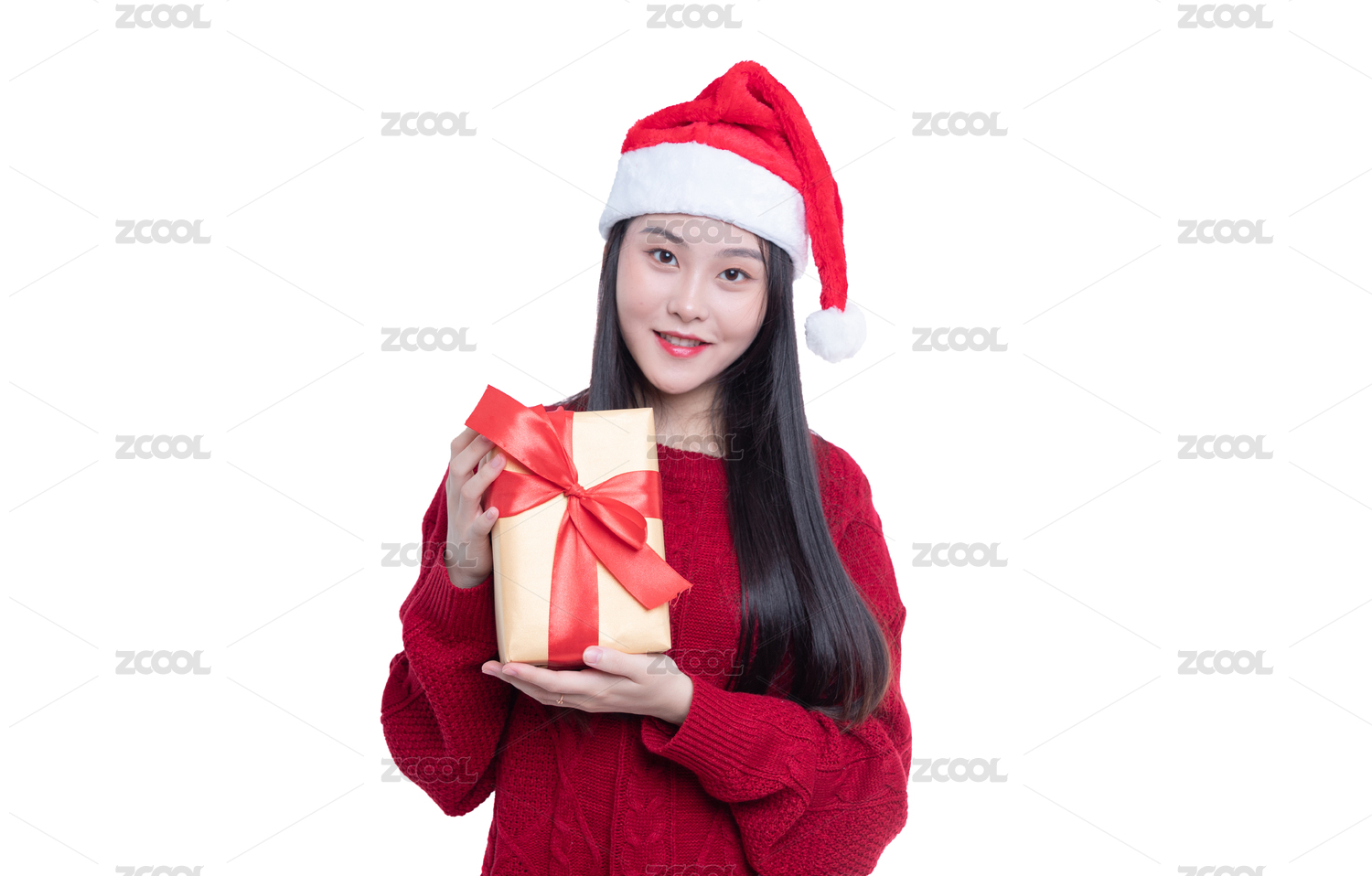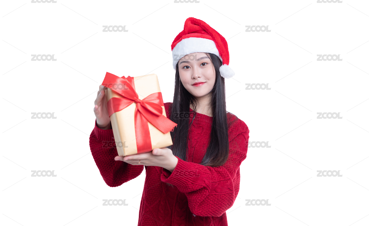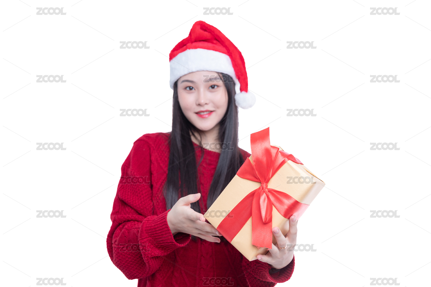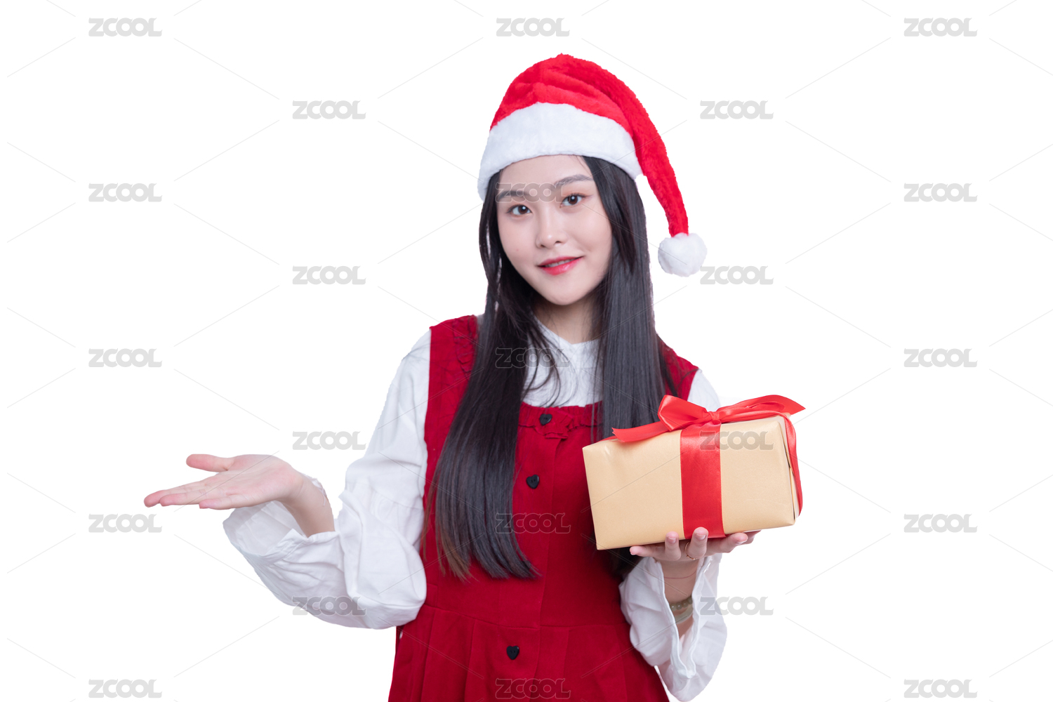 圣诞节一个中国美女拿着圣诞节礼盒庆祝祝福圣诞节快乐,表达着惊喜与开心高兴与幸福,感恩与感谢