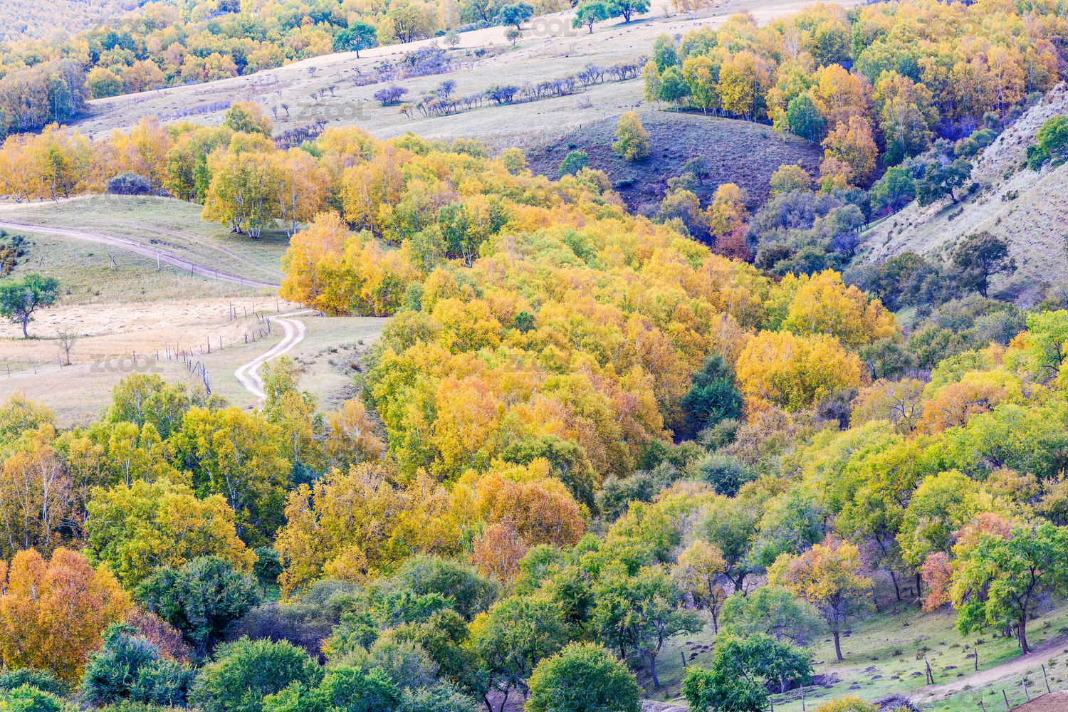 秋天内蒙古赤峰的蛤蟆坝景区的山坡草地树林