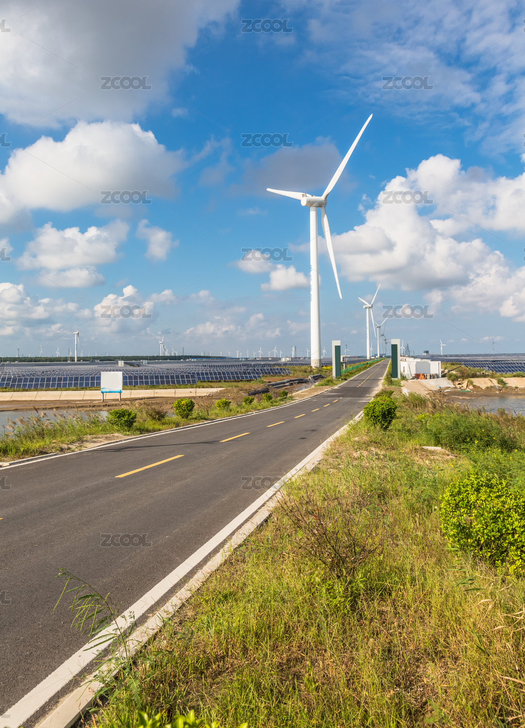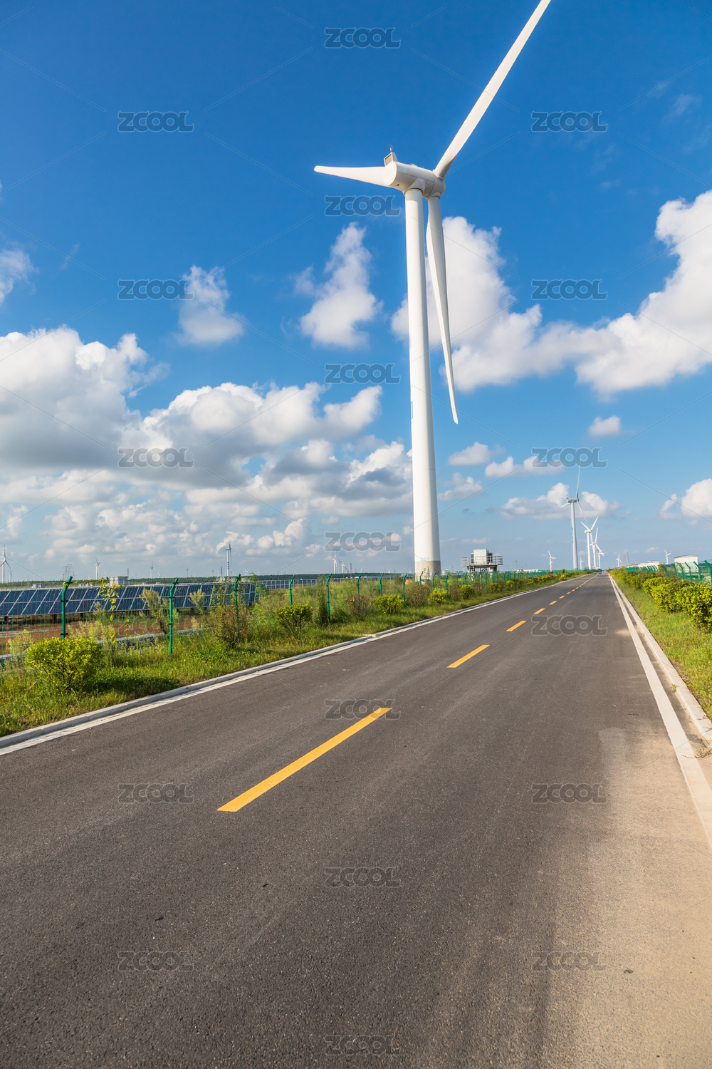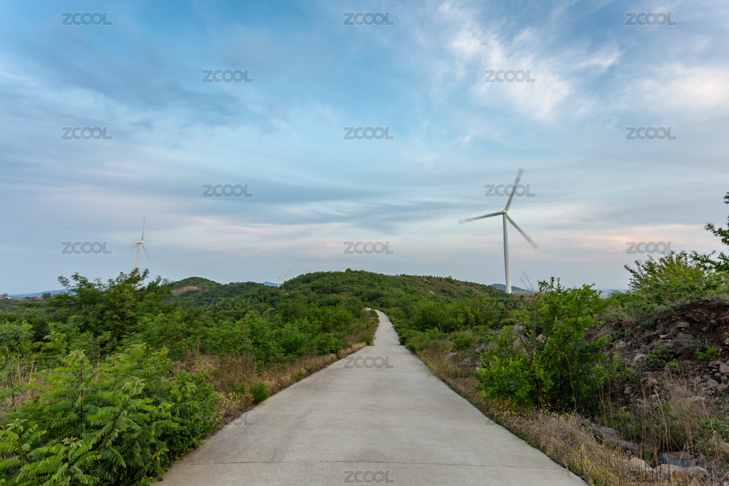 风力涡轮机上沿对天空空的道路景观。