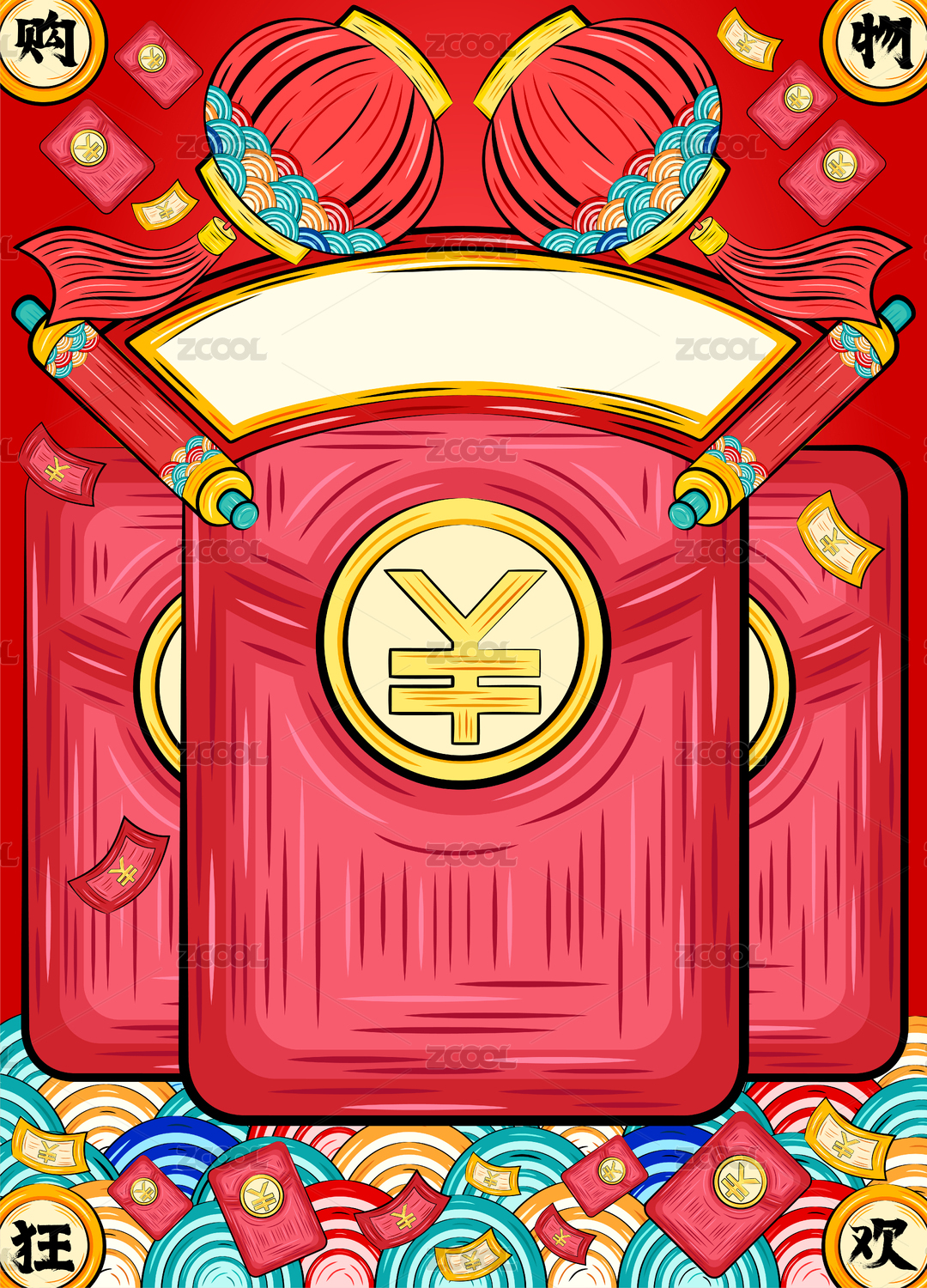 国潮红包雨优惠券灯笼欢庆购物狂欢节插画