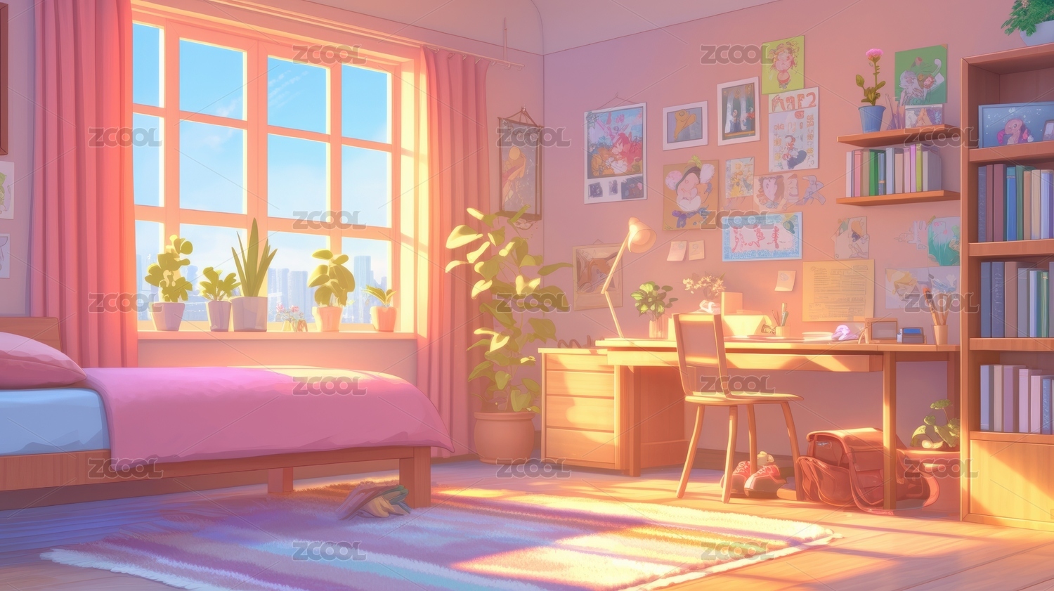 儿童房,卡通,学习,窗户,阳光,卧室,儿童,场景插画,卡通场景,插画