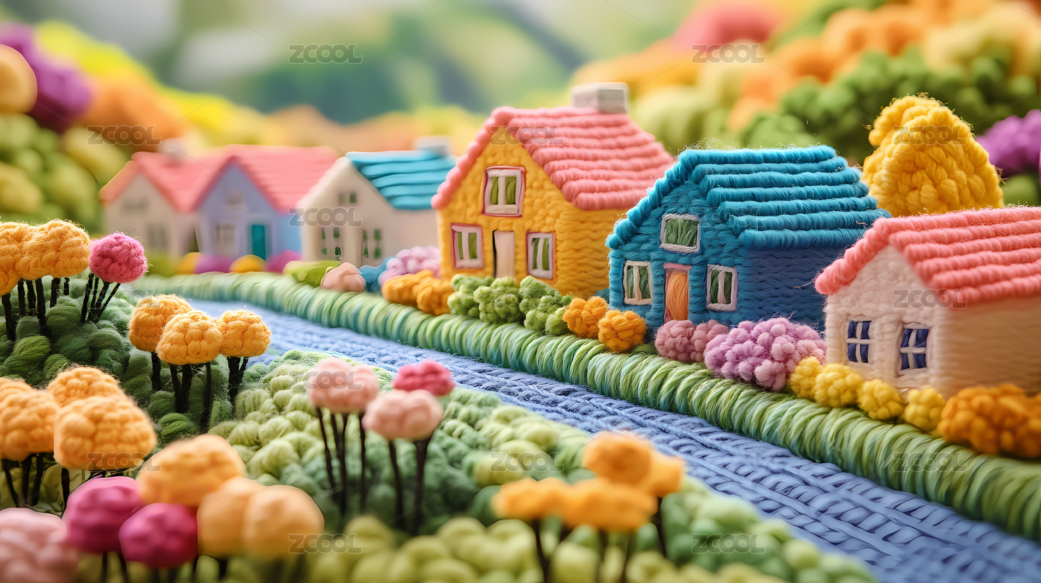 可爱彩色毛绒毛线现代城市建筑3D卡通立体