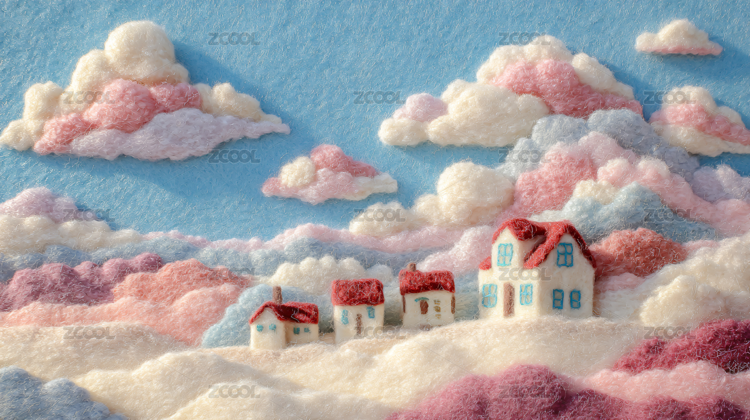 粉蓝羊毛毡小屋风景创意装饰背景图