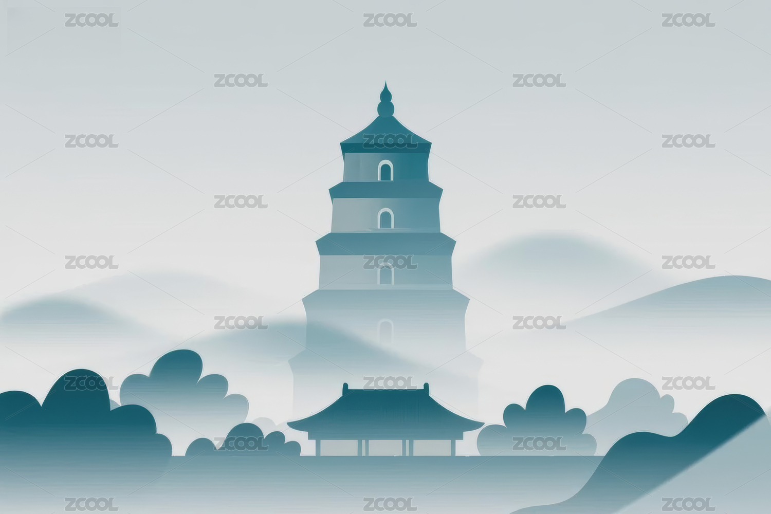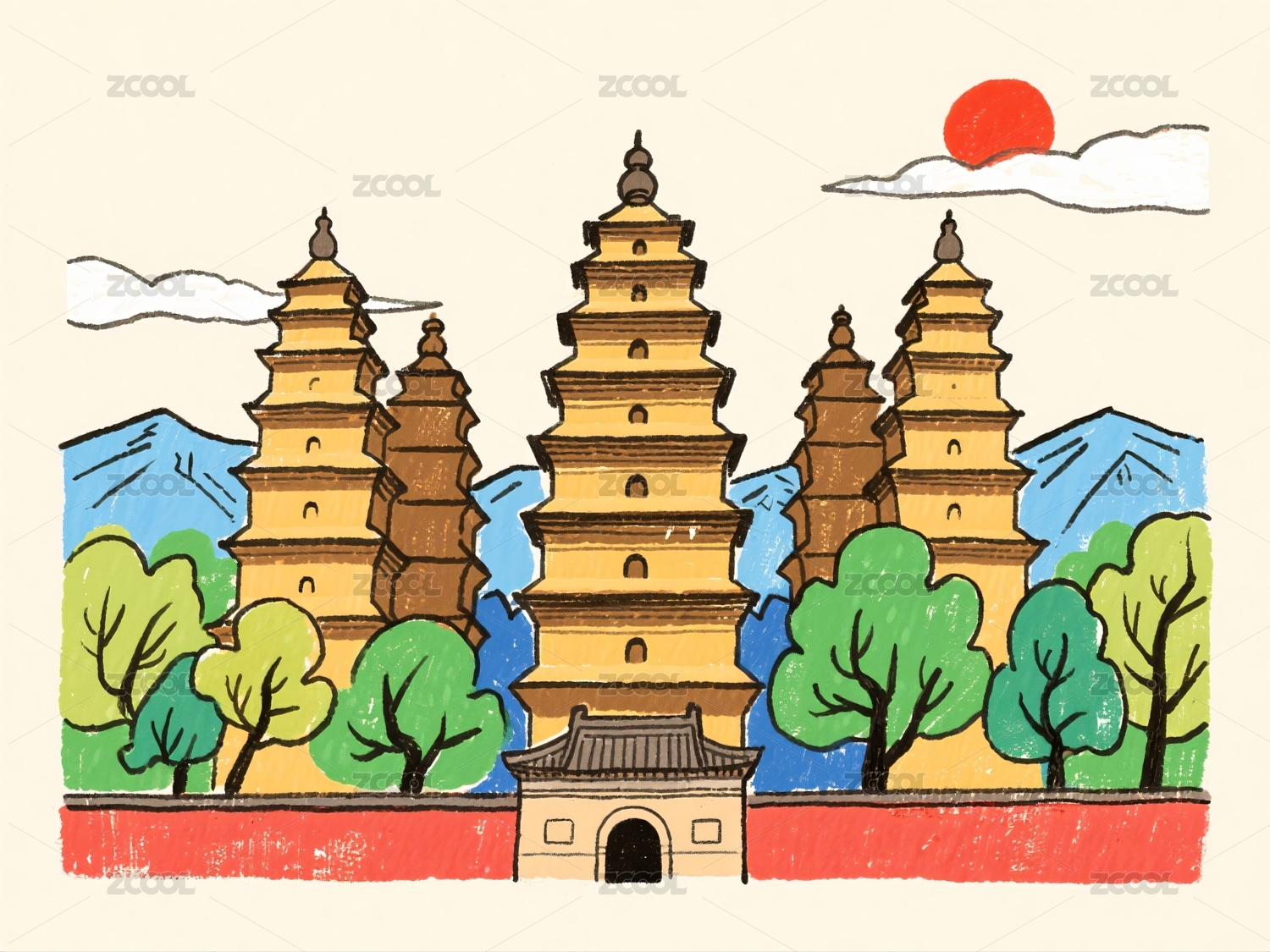 西安大慈恩寺佛塔大雁塔手绘古风插画矢量图