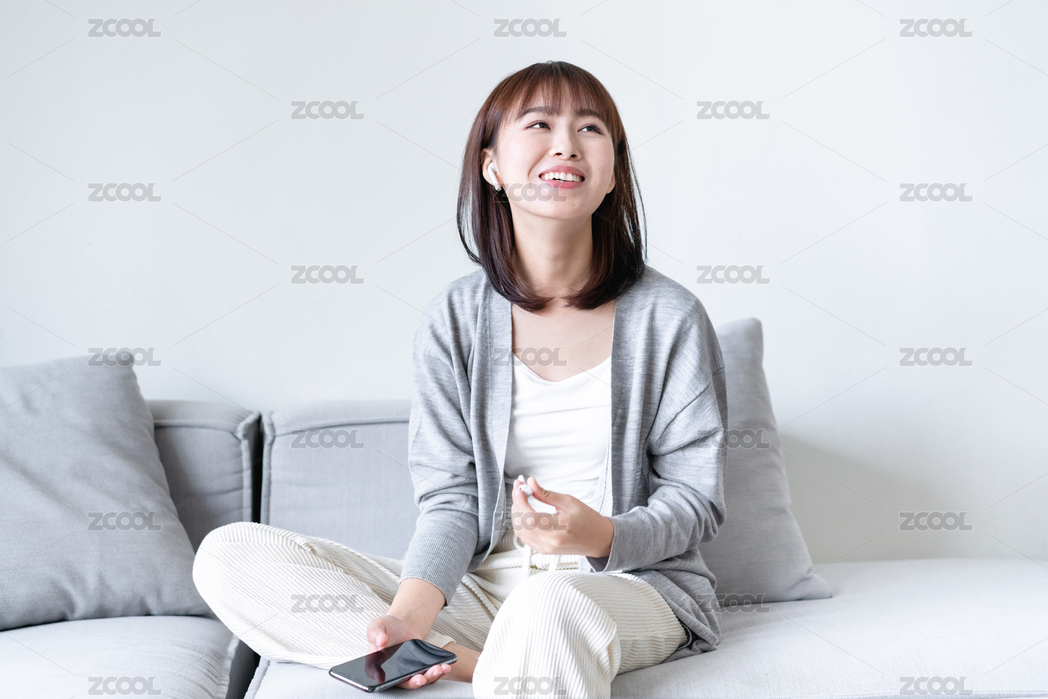 年轻的亚洲女生拿着手机靠在沙发上思考