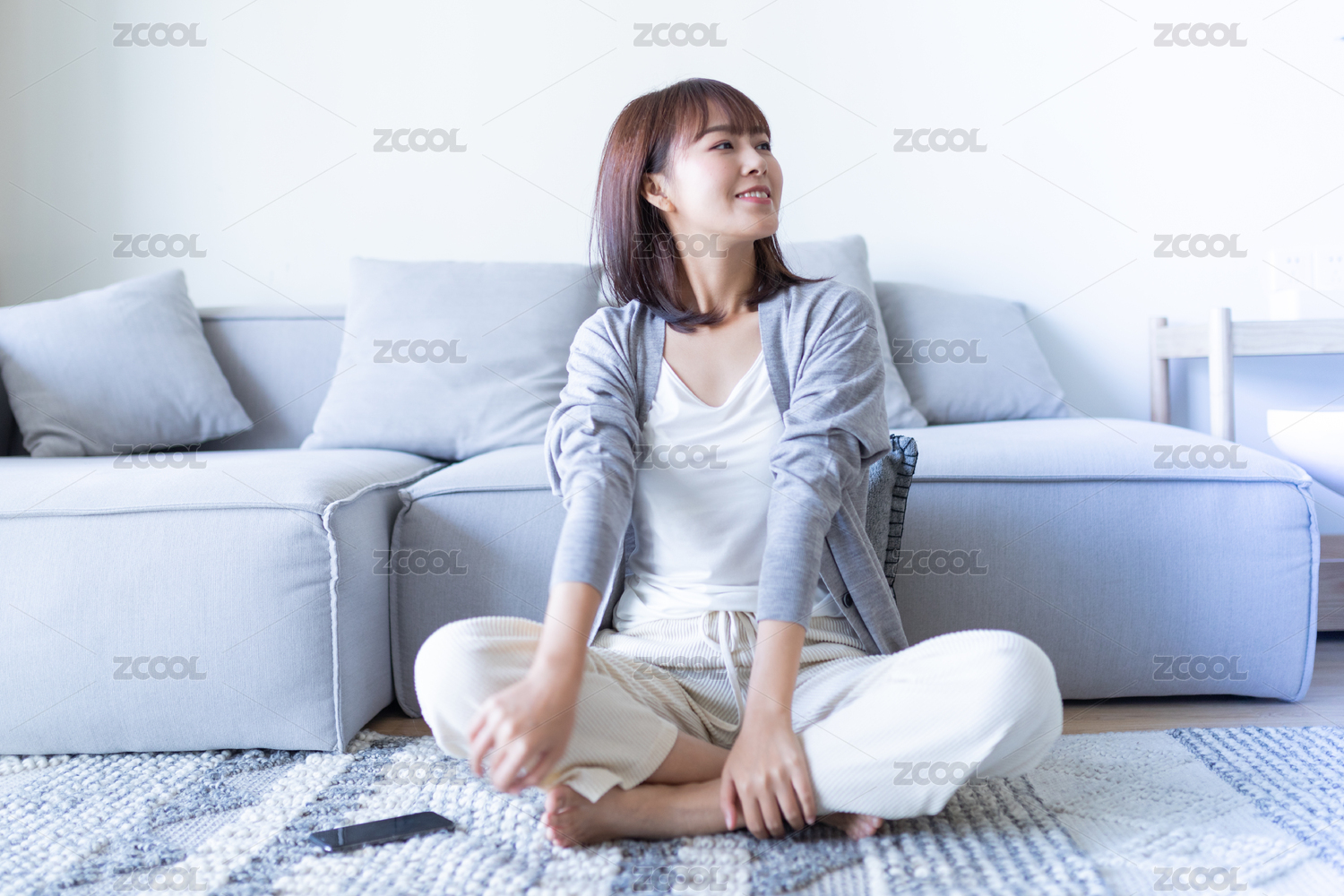 年轻女性坐在客厅沙发上靠着抱枕小憩