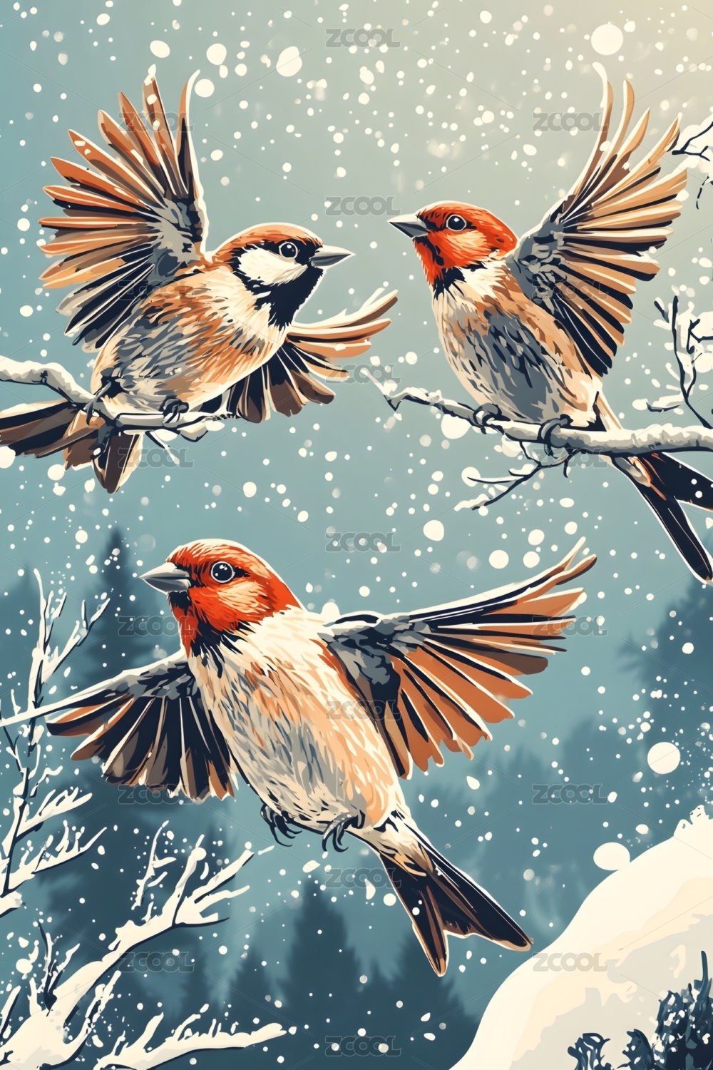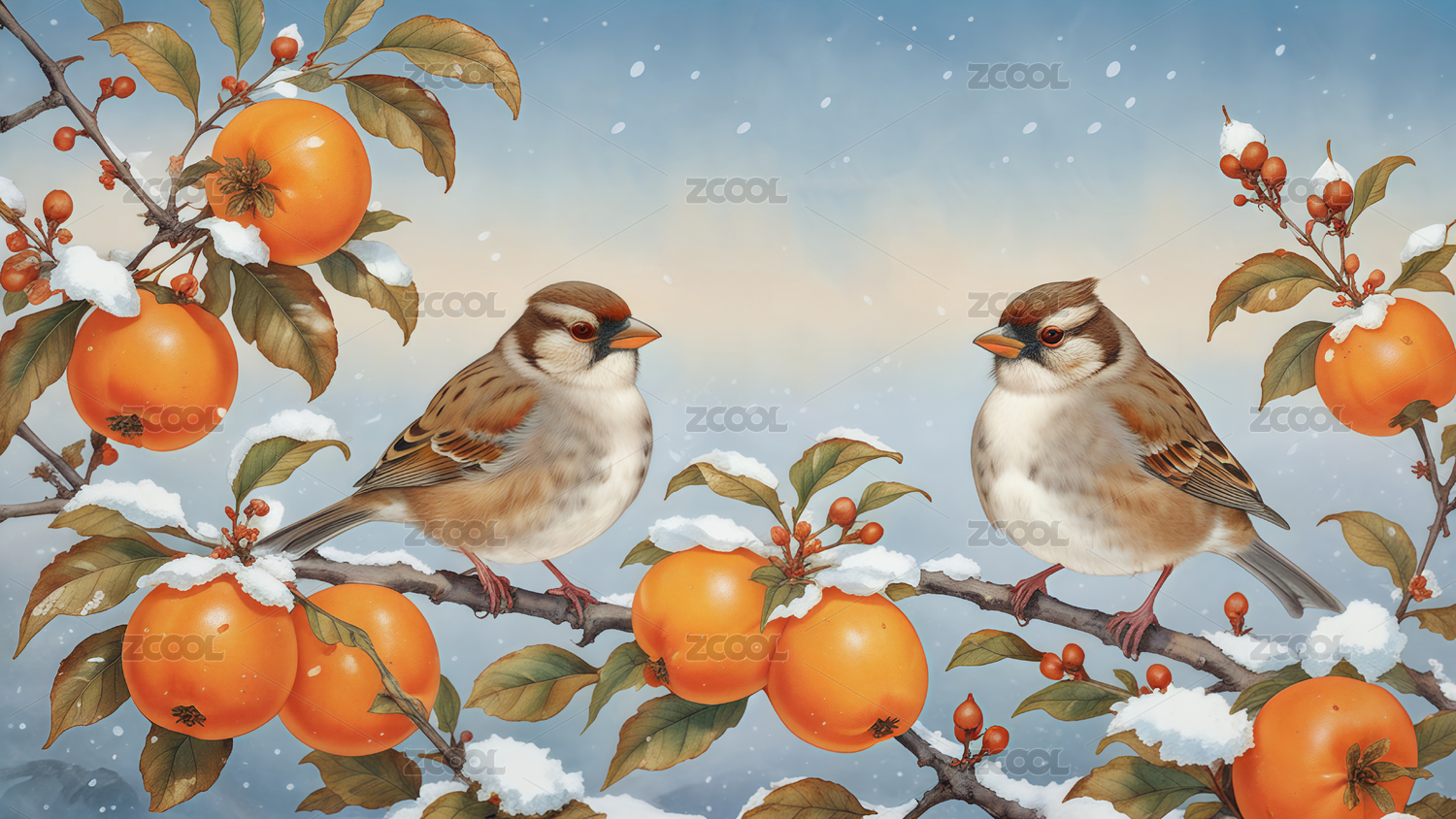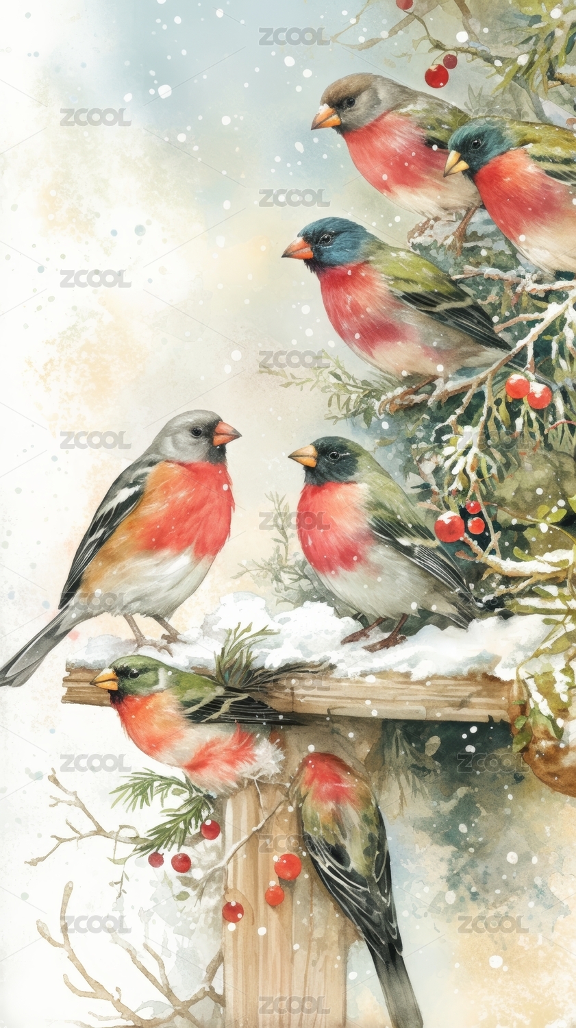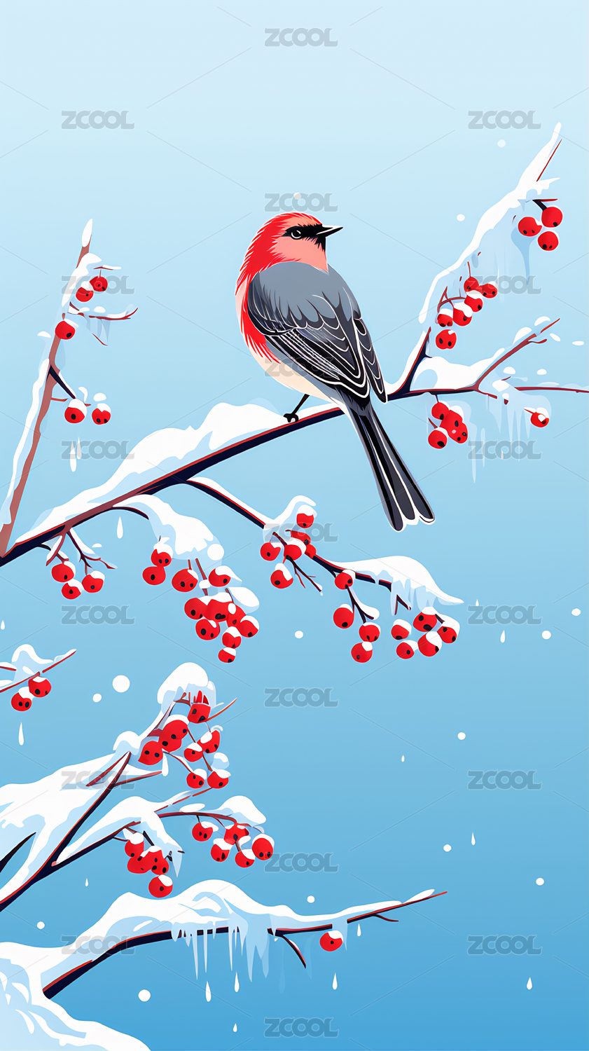 水彩风格下雪的冬天小鸟站在节满果实树枝上