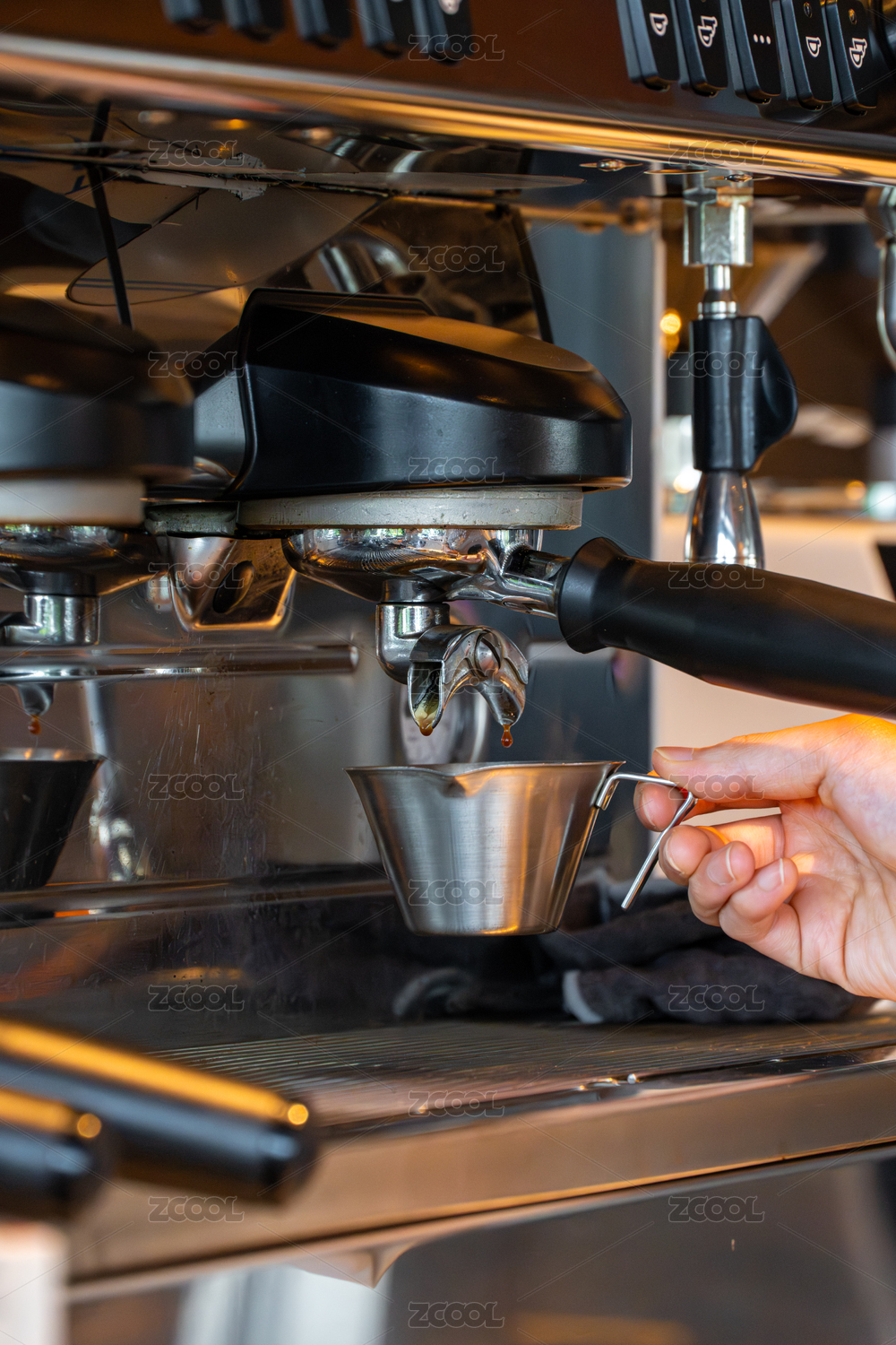 咖啡师正在使用意式咖啡机萃取浓缩咖啡
