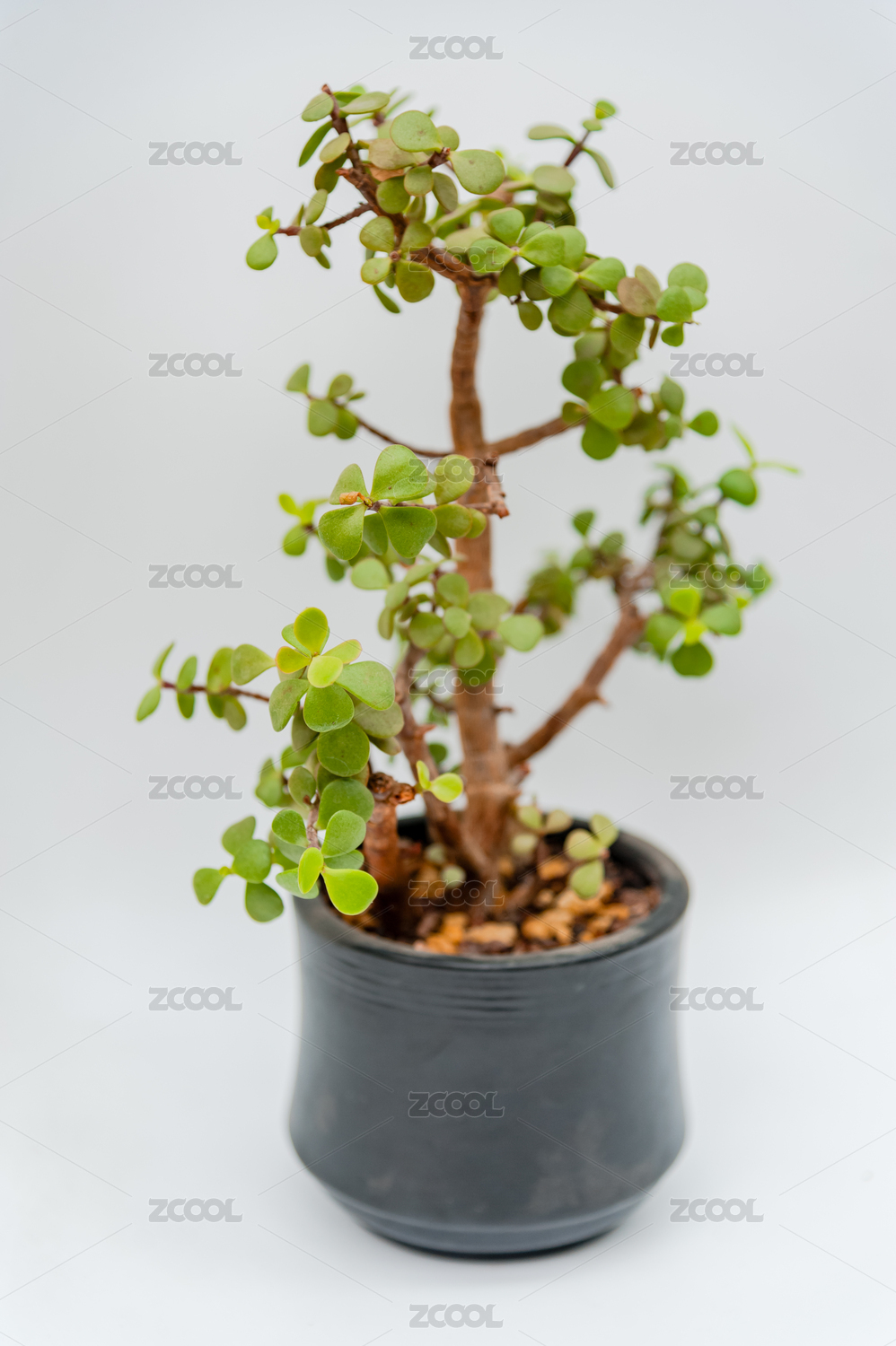 桌子上的锅里一棵盆景树高清图片