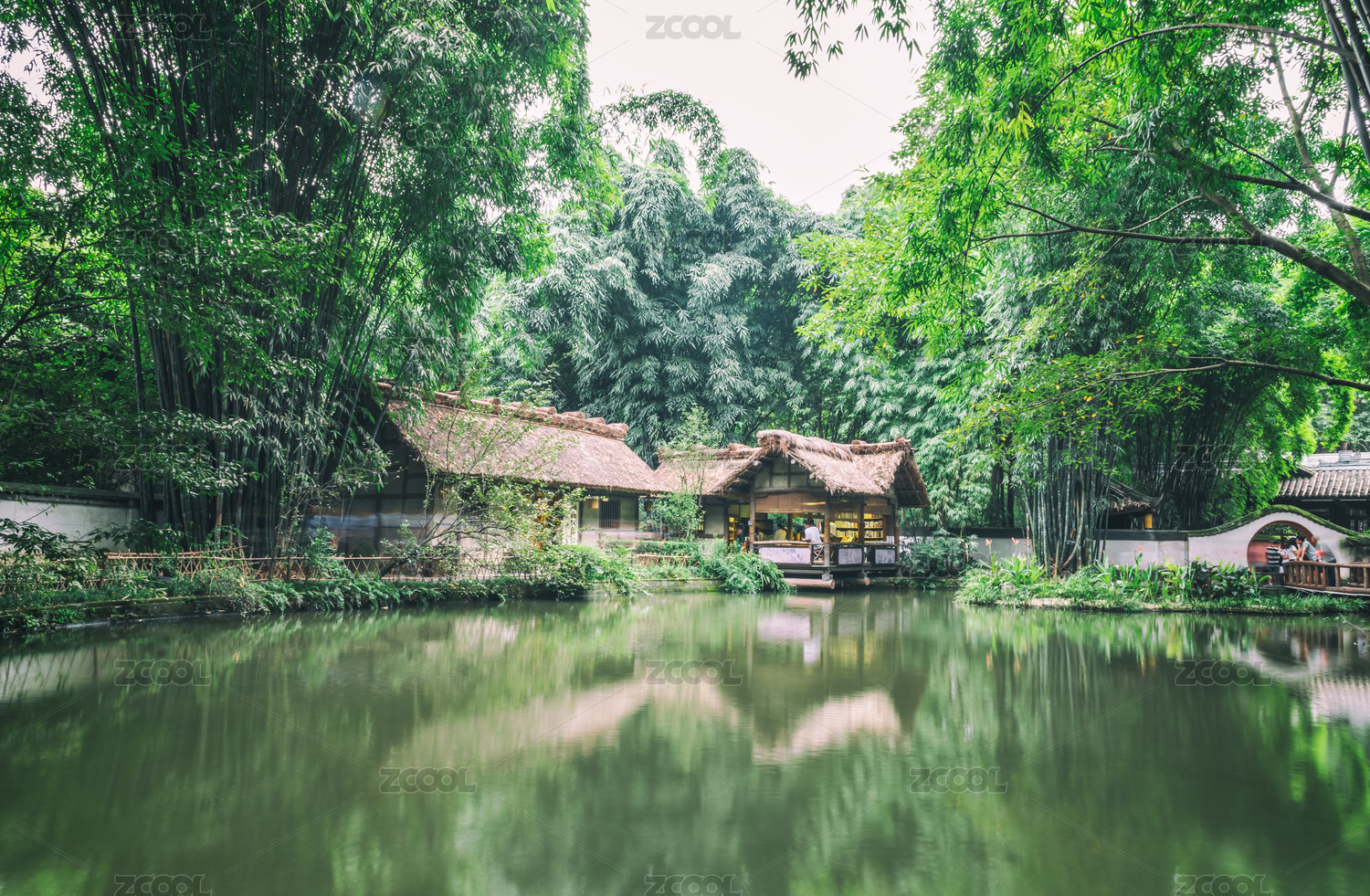 绿色,红,树,草,成都,杜甫草堂,无人,草房,倒影,水