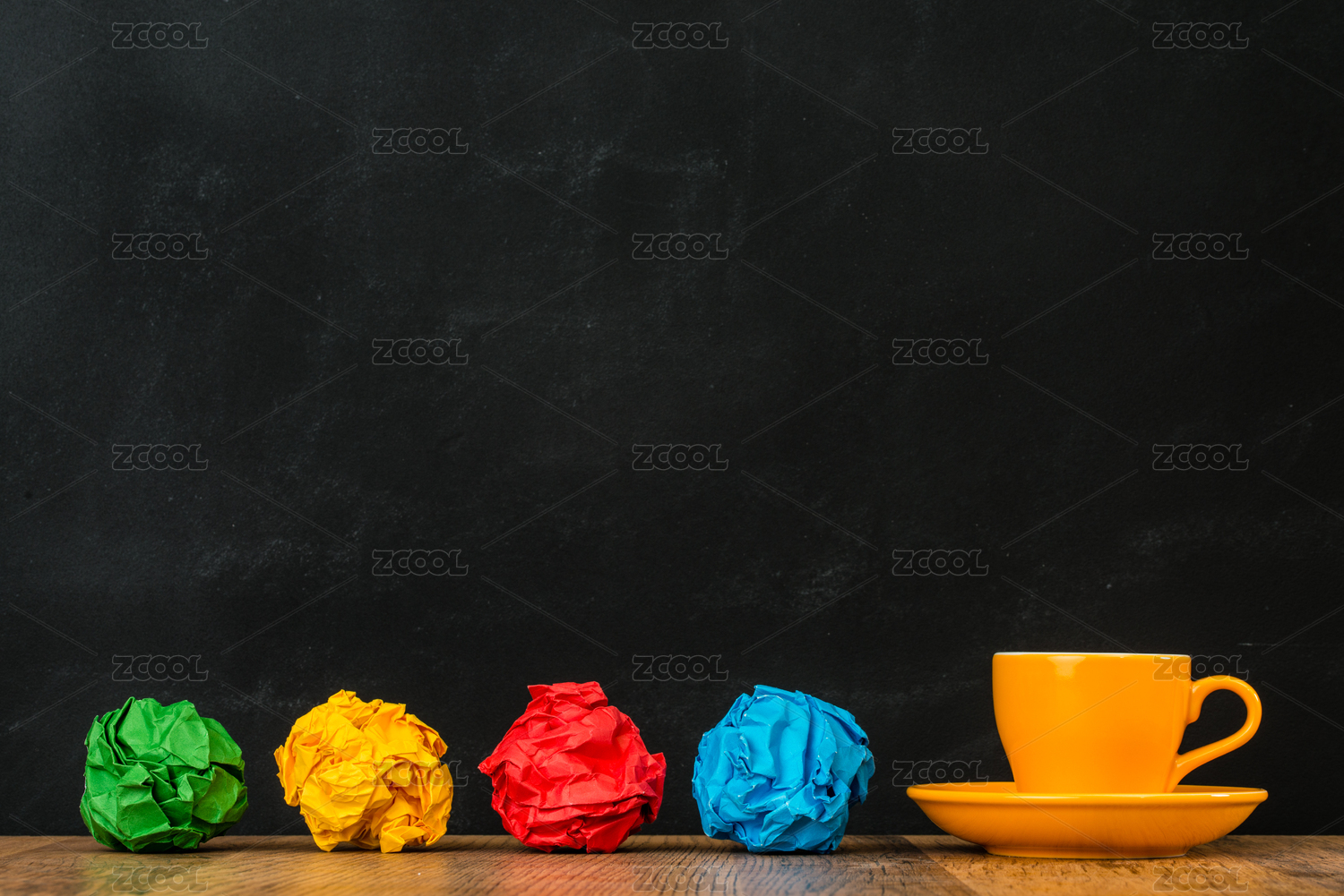 橙色的咖啡杯放在复古风格的工作室在木质感表COPYSPACE的黑板墙背景设计创作安排彩虹纸球。