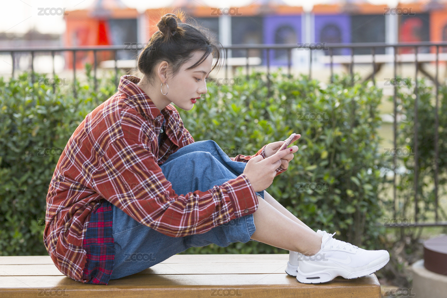 休闲城市漂亮的女孩发短信消息,并享受晴朗的天气白天和河滨公园。