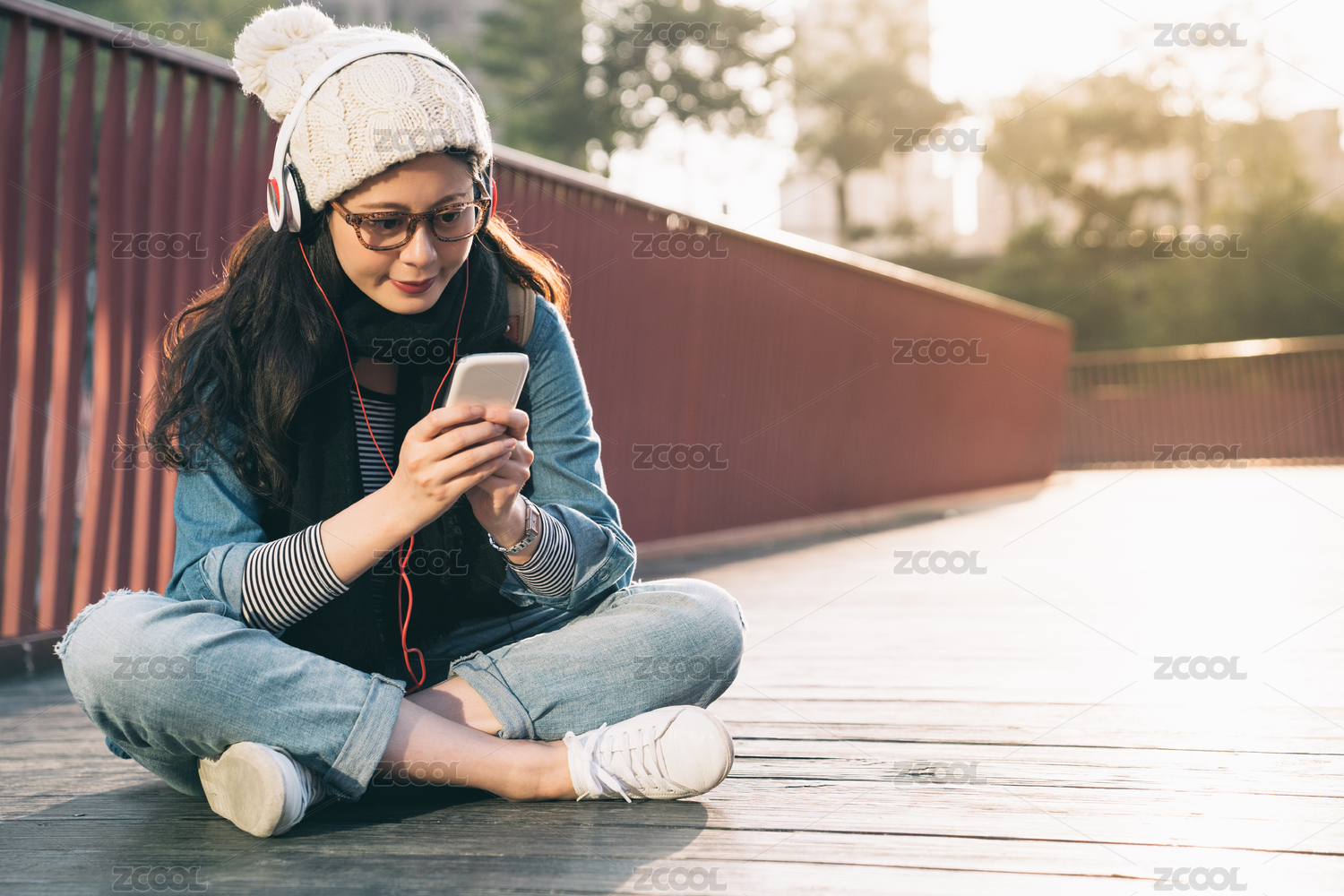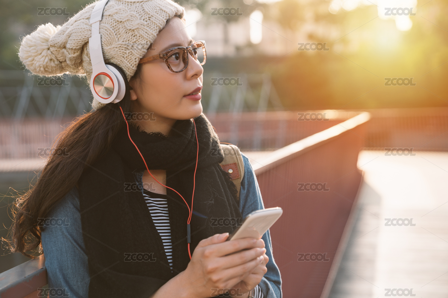 时尚迷人的亚洲女人喜欢智能手机的音乐在城市桥梁,女孩享受阳光灿烂的日子在冬季。