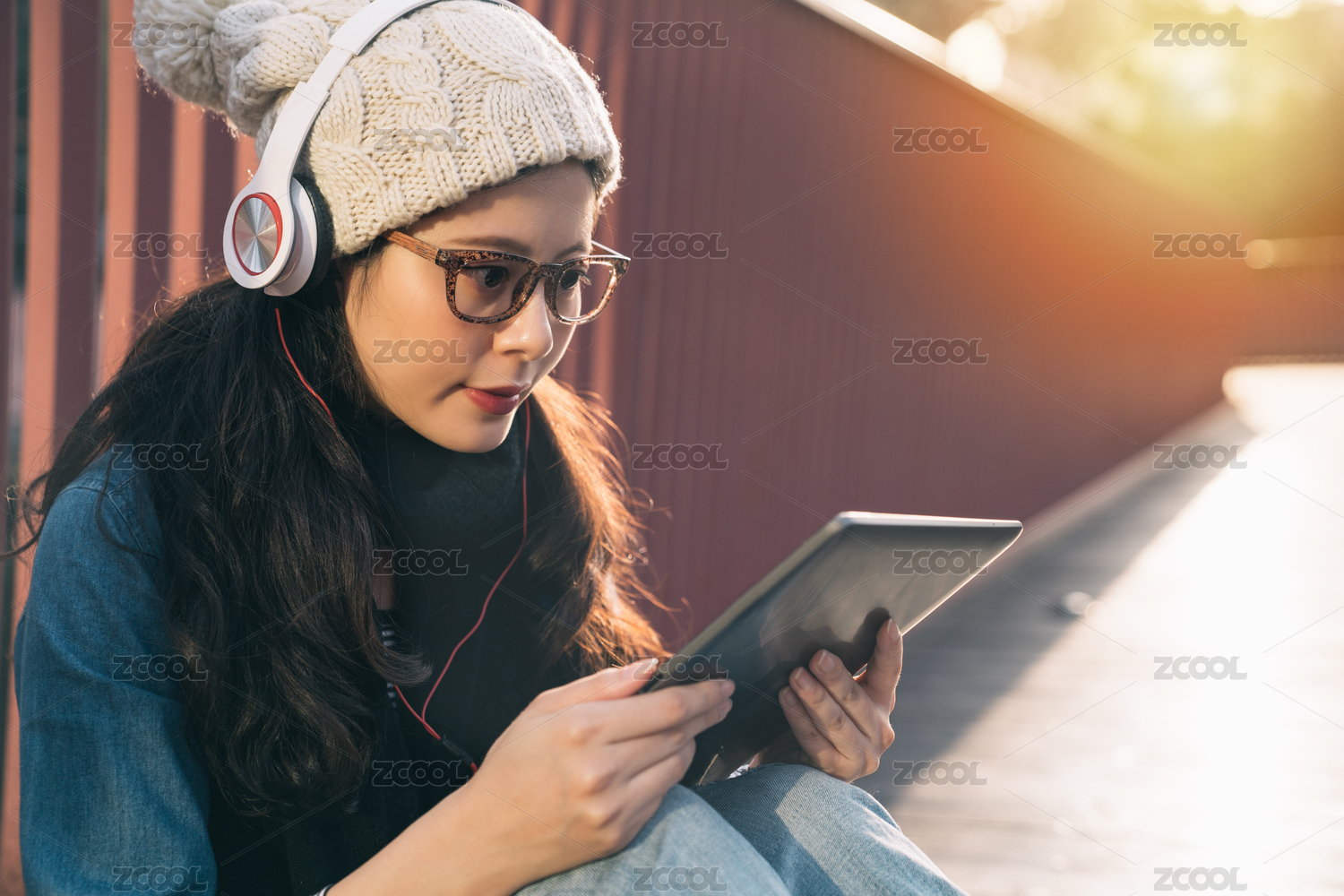 美丽的女子亚洲户外坐和使用平板电脑看在一个阳光明媚的冬季媒体内容