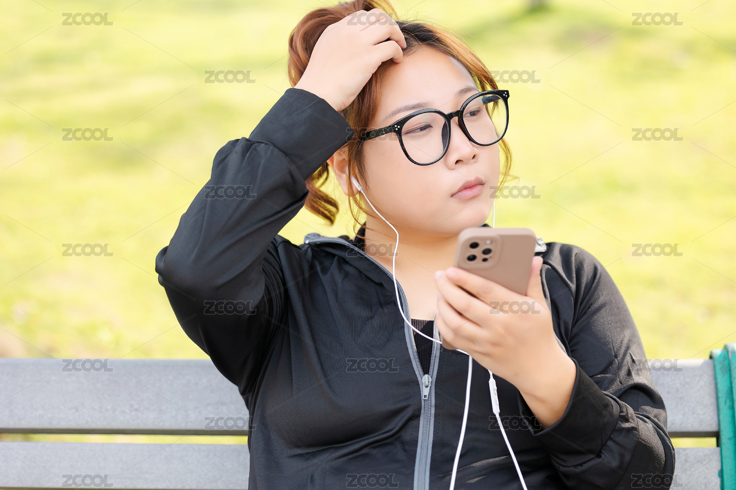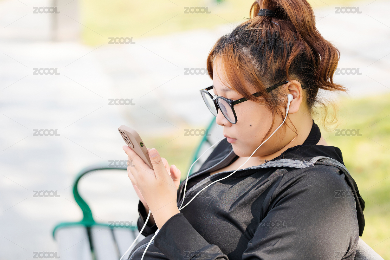 亚洲女学生学习听在公园里坐在一个公园的草地音频教程。
