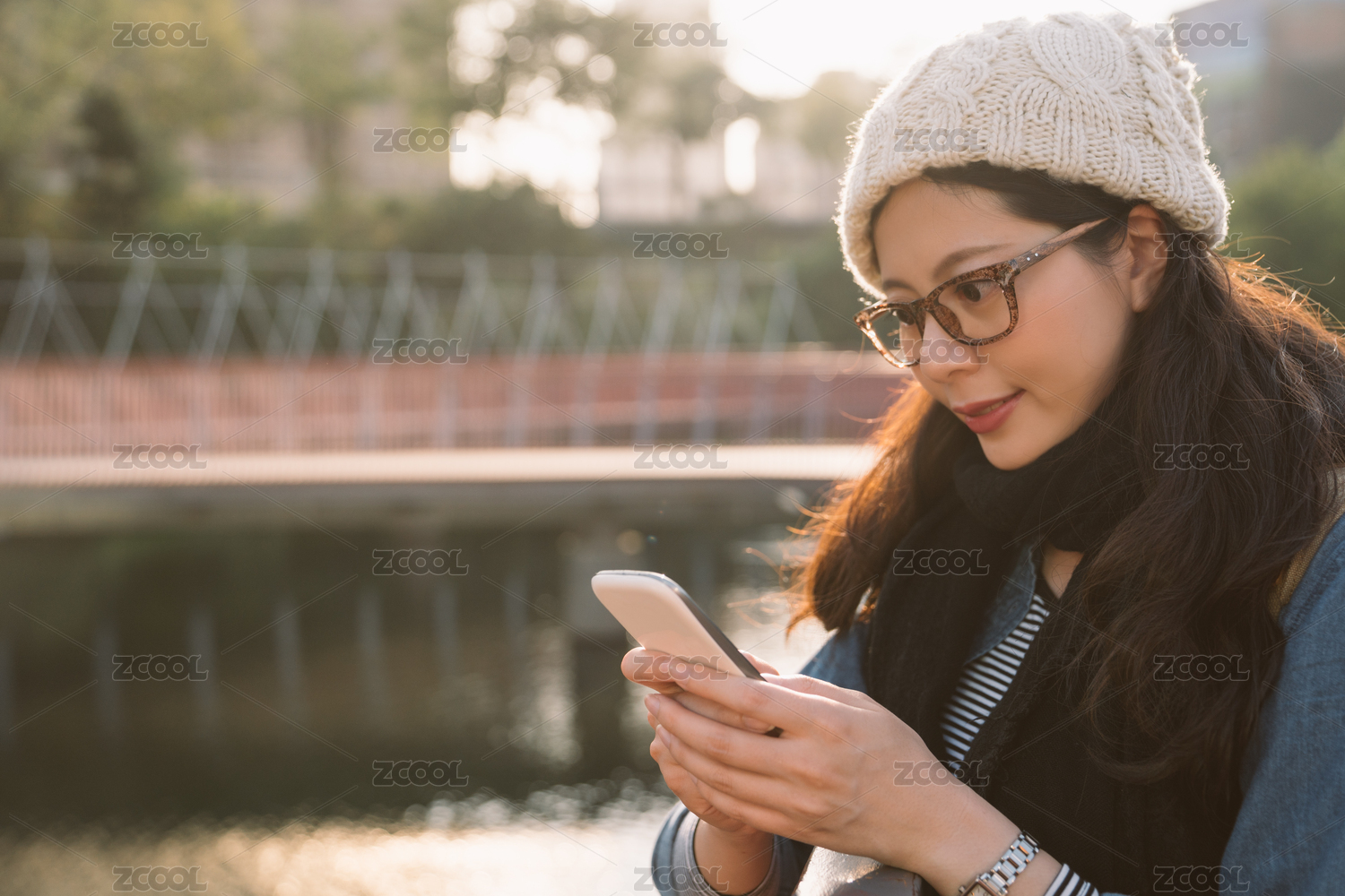 智能手机发短信的女孩在城市市桥头,亚洲女子拿着手机阅读或使用社交媒体在冬天穿的毛线帽。