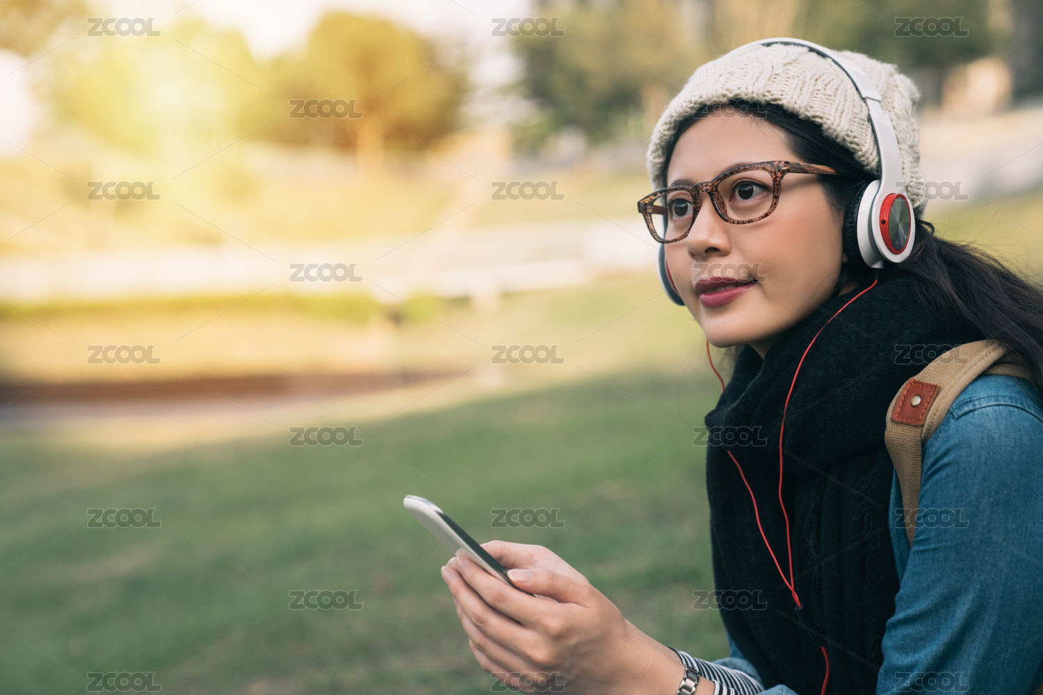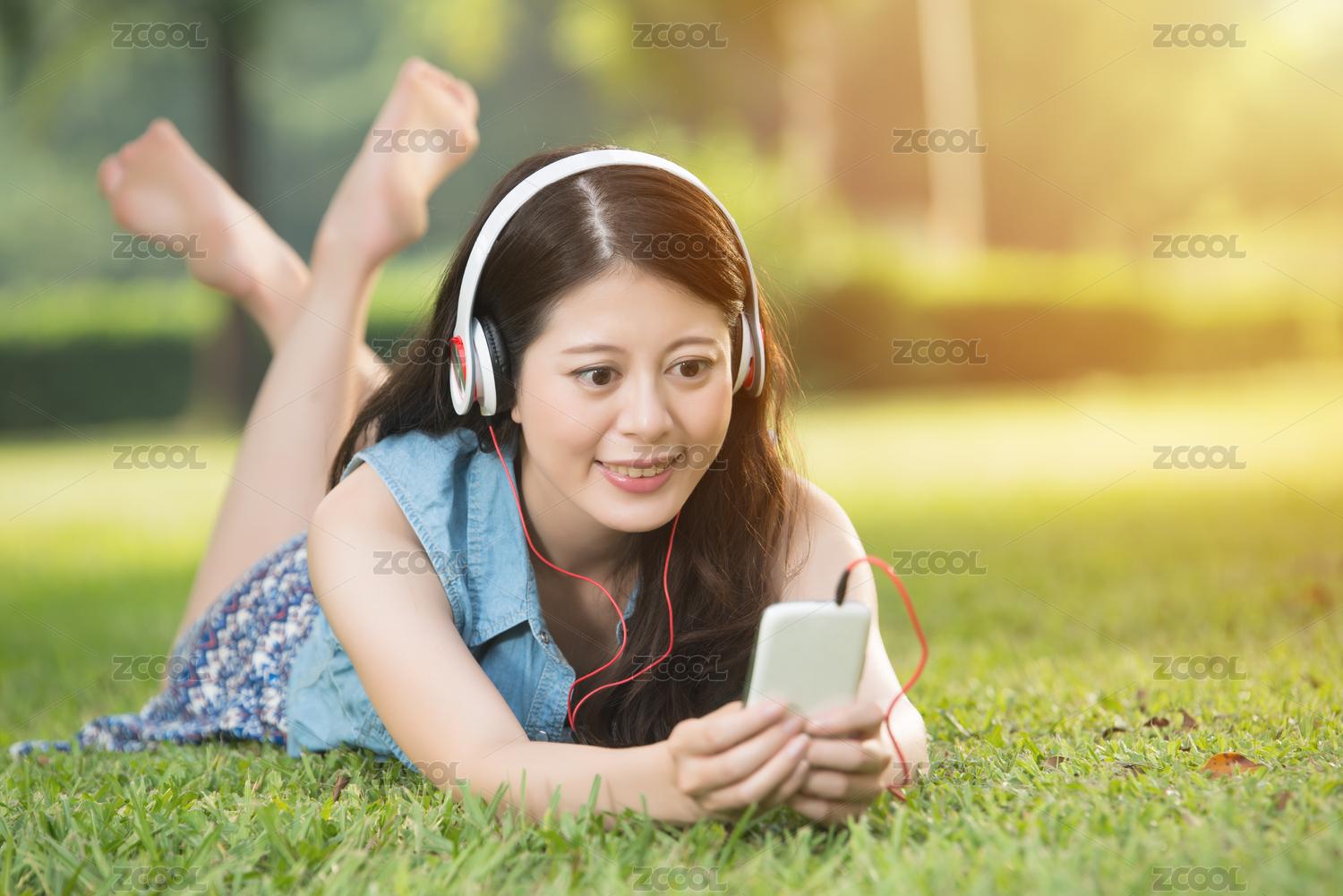 美丽的亚洲女子听音乐与在户外公园草地上的智能手机。大自然户外背景。人才和技术概念