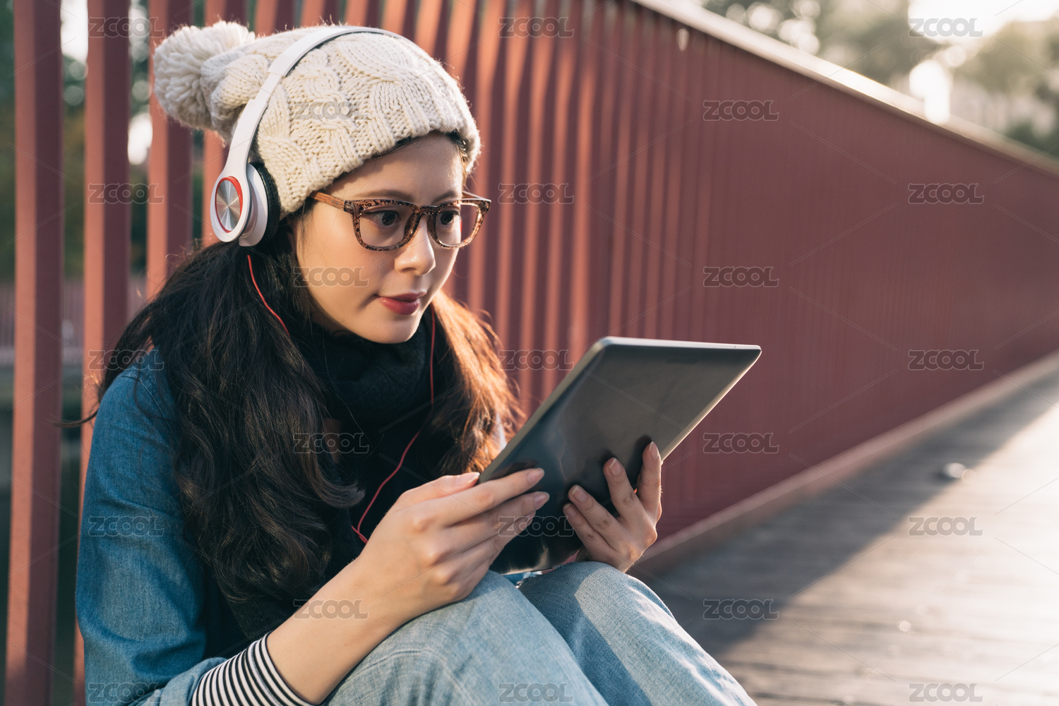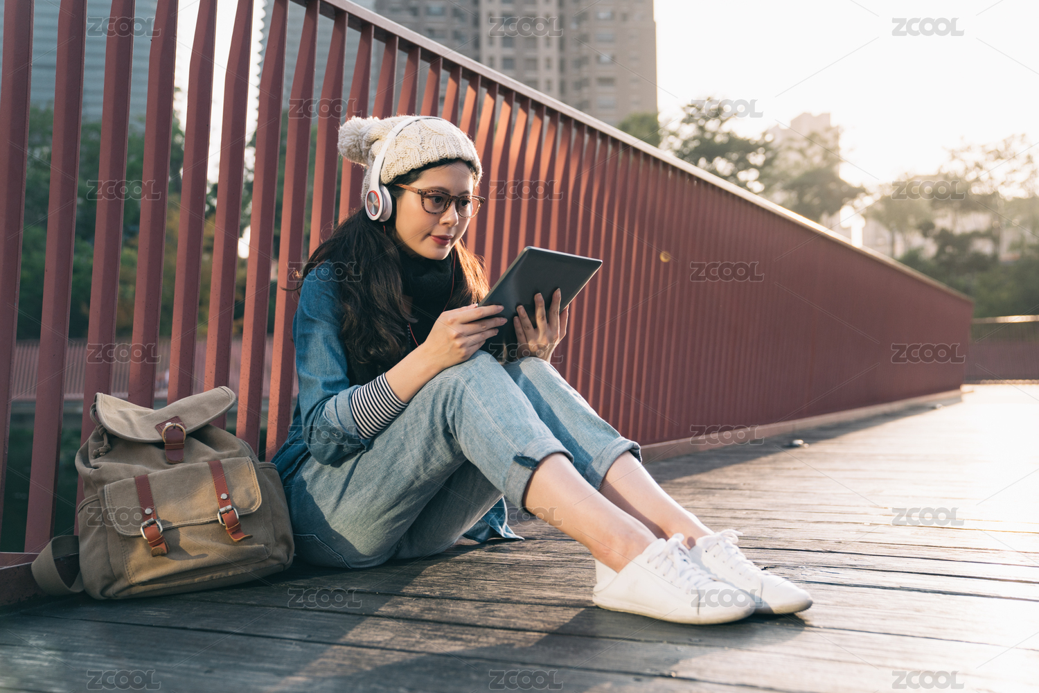 上述观点年轻漂亮的亚洲学生与数字平板电脑坐在桥的木地板网上的信息检索。